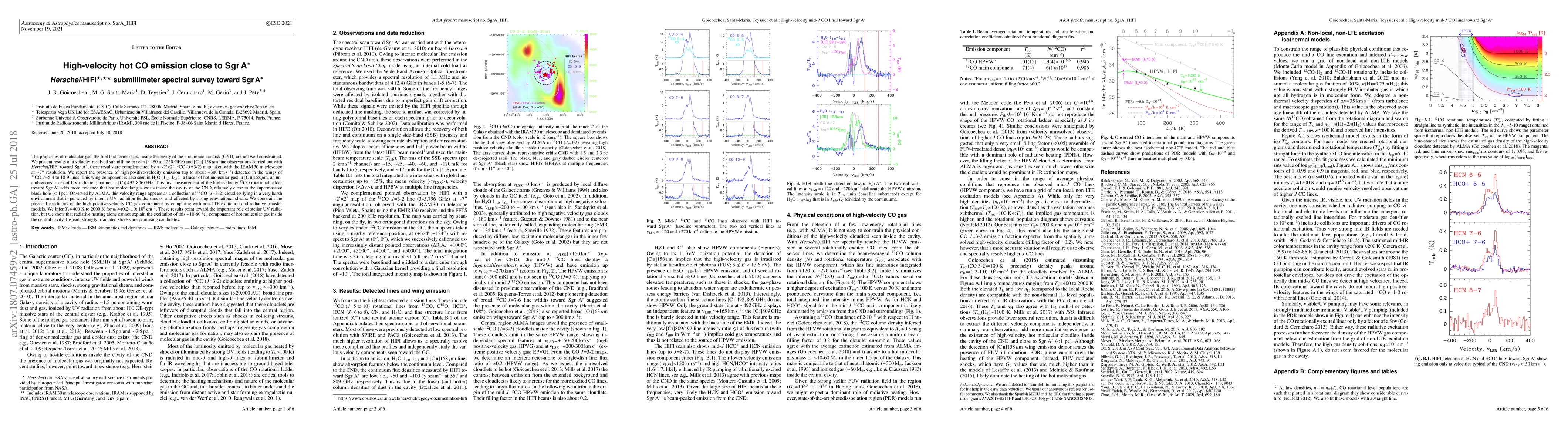 This study reveals high-velocity CO emission near Sgr A* using Herschel/HIFI and IRAM 30 m telescope observations, indicating the presence of hot molecular gas within the circumnuclear disk's cavity. The findings suggest that intense UV radiation and shocks, rather than radiative heating alone, are likely responsible for the gas's excitation.