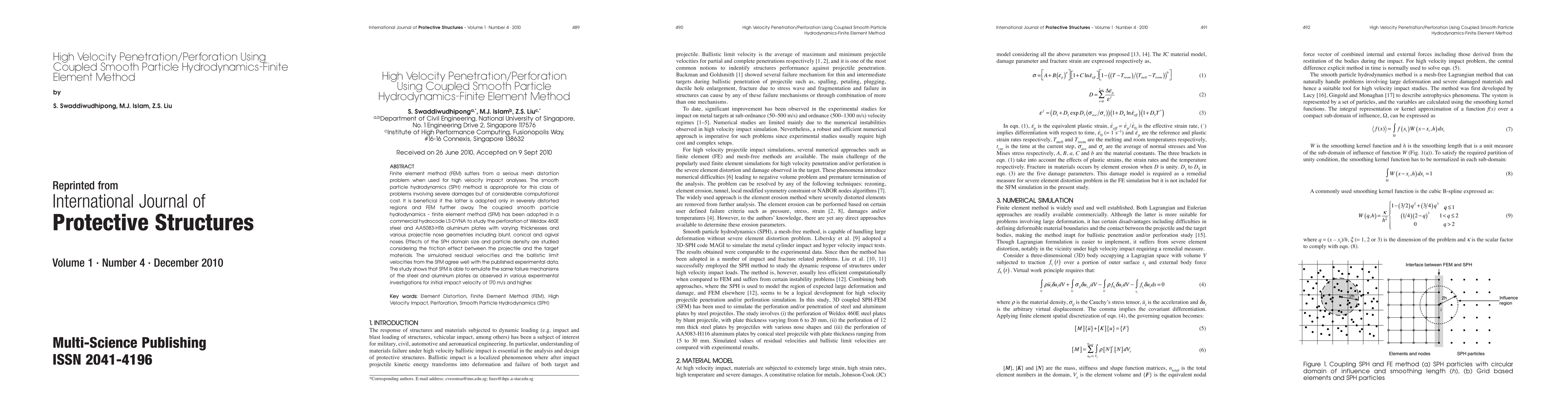 This paper investigates high velocity penetration using a coupled smooth particle hydrodynamics-finite element method (SFM) to address mesh distortion issues in FEM. SFM is shown to accurately simulate perforation of steel and aluminum plates, with results matching experimental data, demonstrating its effectiveness for high velocity impact analyses.