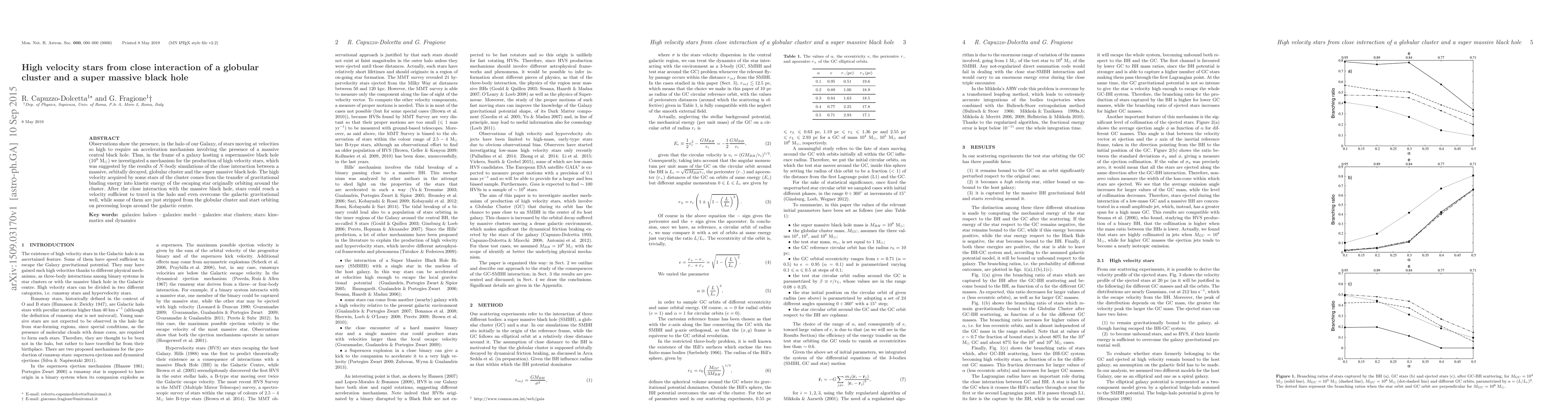 Observations show the presence, in the halo of our Galaxy, of stars moving at velocities so high to require an acceleration mechanism involving the presence of a massive central black hole. Thus, in the frame of a galaxy hosting a supermassive black hole ($10^8$ $M_{\odot}$) we investigated a mechanism for the production of high velocity stars, which was suggested by the results of N-body simulations of the close interaction between a massive, orbitally decayed, globular cluster and the super massive black hole. The high velocity acquired by some stars of the cluster comes from the transfer of gravitational binding energy into kinetic energy of the escaping star originally orbiting around the cluster. After the close interaction with the massive black hole, stars could reach a velocity sufficient to travel in the halo and even overcome the galactic gravitational well, while some of them are just stripped from the globular cluster and start orbiting on precessing loops around the galactic centre.