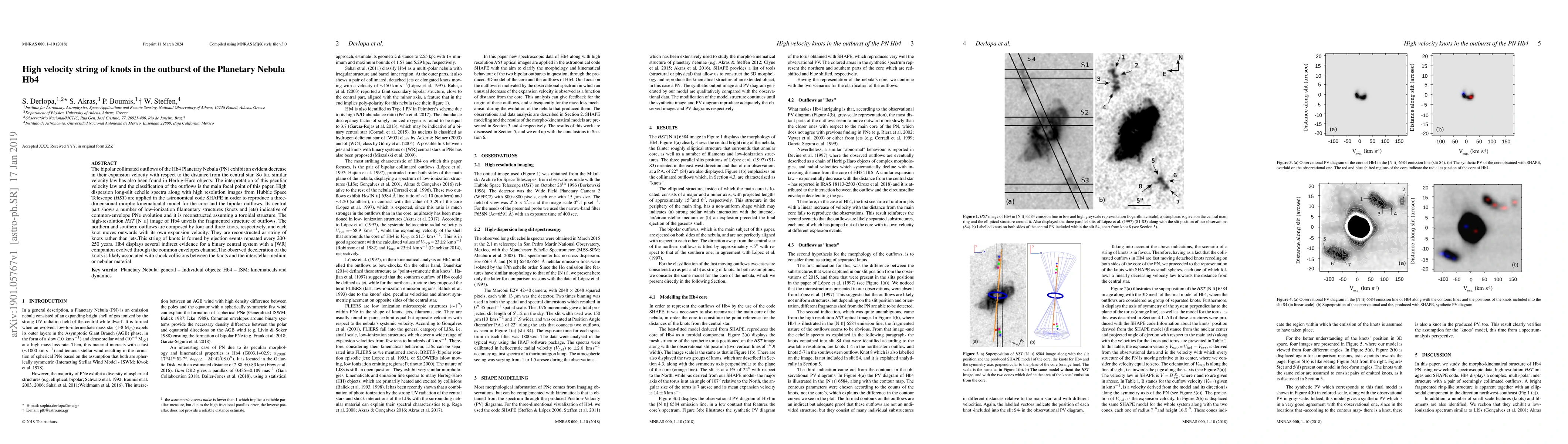 The Hb4 Planetary Nebula's outflows exhibit a peculiar velocity law where expansion velocity decreases with distance from the central star, forming a string of knots rather than jets. This is likely due to shock collisions between knots and interstellar medium.