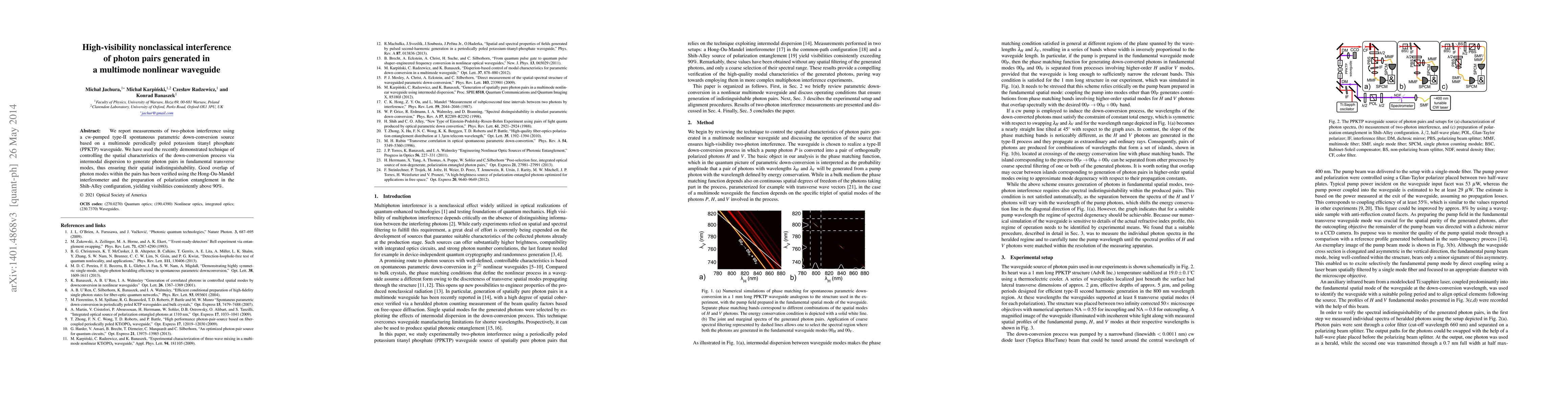 This paper reports high-visibility two-photon interference using photon pairs generated in a multimode nonlinear waveguide, demonstrating spatial indistinguishability and achieving interference visibilities consistently above 90% via controlled down-conversion and entanglement preparation techniques.