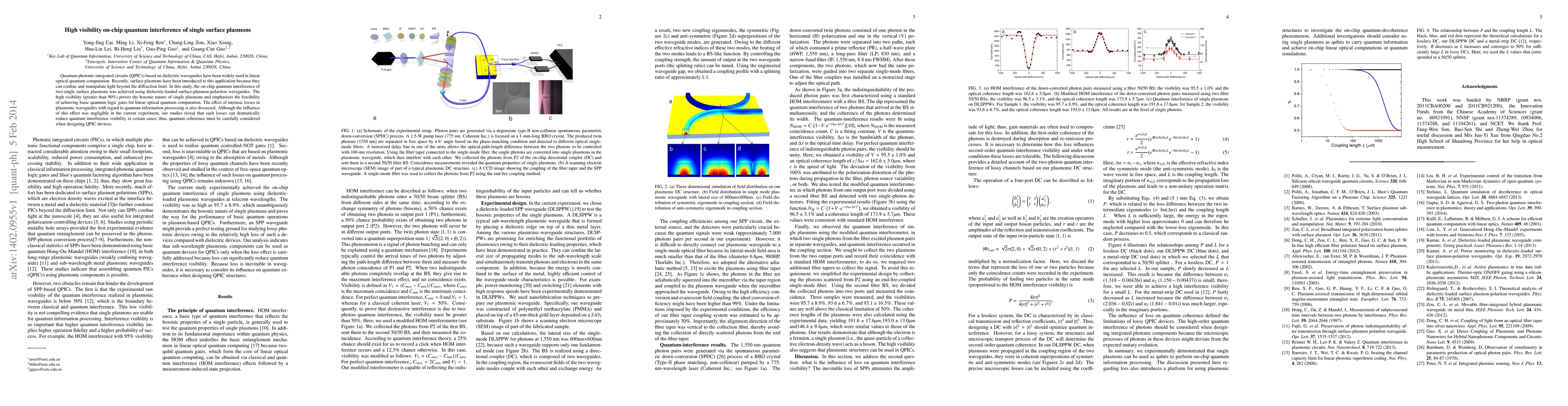 This research demonstrates high visibility quantum interference of single surface plasmons in dielectric-loaded waveguides, confirming their bosonic nature and potential for quantum logic gates. It also highlights the impact of intrinsic losses on quantum coherence, emphasizing the need for careful design in quantum photonic integrated circuits.