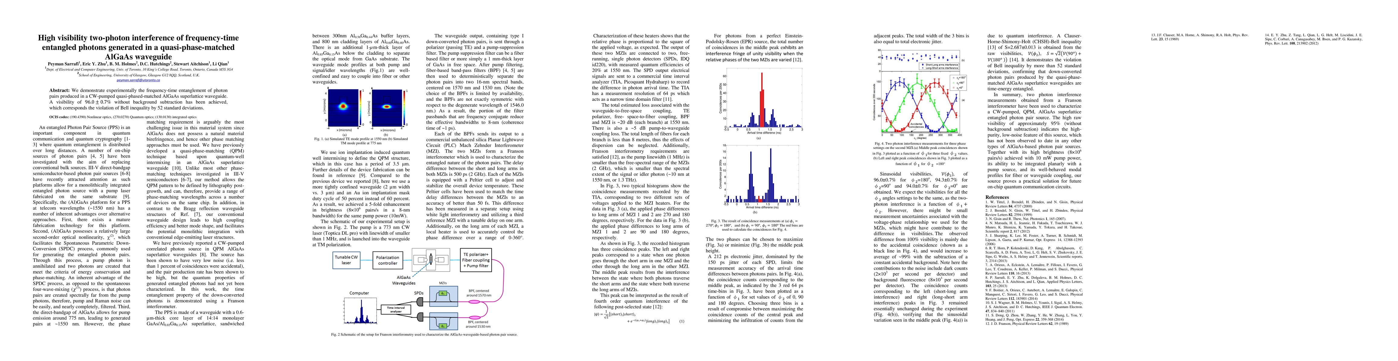 This paper demonstrates high visibility two-photon interference using frequency-time entangled photons generated in a quasi phase matched AlGaAs waveguide, achieving a visibility of 96.0±0.7% and a Bell inequality violation by 52 standard deviations.