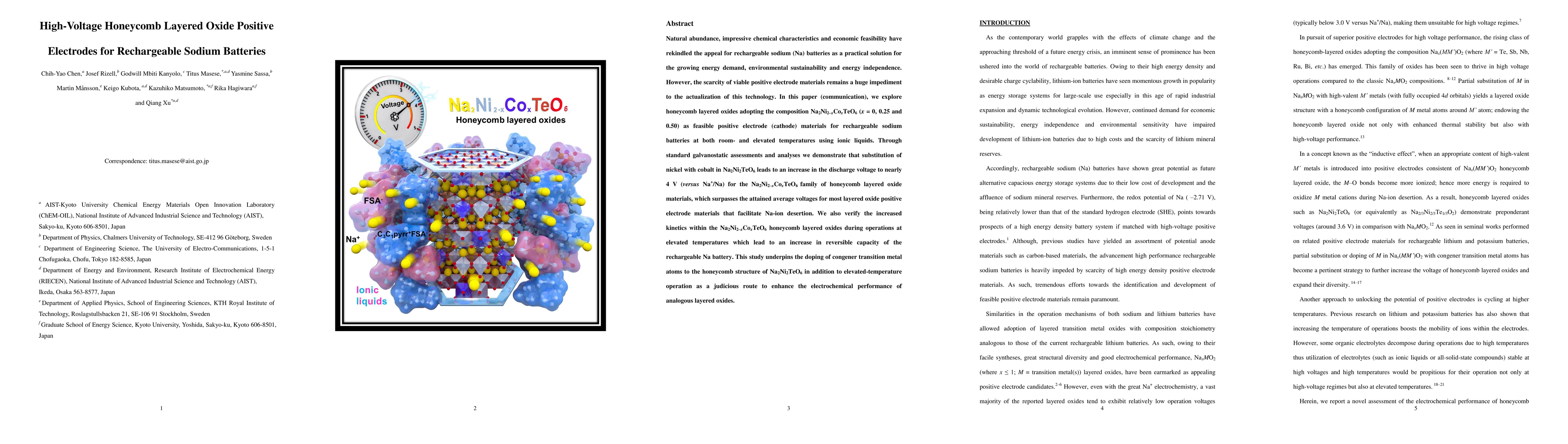 Natural abundance, impressive chemical characteristics and economic feasibility have rekindled the appeal for rechargeable sodium (Na) batteries as a practical solution for the growing energy demand, environmental sustainability and energy independence. However, the scarcity of viable positive electrode materials remains a huge impediment to the actualization of this technology. In this paper, we explore honeycomb layered oxides adopting the composition Na$_2$Ni$_{2-x}$Co$_x$TeO$_6$ ($x = 0, 0.25$ and $0.50$) as feasible positive electrode (cathode) materials for rechargeable sodium batteries at both room- and elevated temperatures using ionic liquids. Through standard galvanostatic assessments and analyses we demonstrate that substitution of nickel with cobalt in Na$_2$Ni$_2$TeO$_6$ leads to an increase in the discharge voltage to nearly $4$ V (versus Na$^+$ / Na) for the Na$_2$Ni$_{2-x}$Co$_x$TeO$_6$ family of honeycomb layered oxide materials, which surpasses the attained average voltages for most layered oxide positive electrode materials that facilitate Na-ion desertion. We also verify the increased kinetics within the Na$_2$Ni$_{2-x}$Co$_x$TeO$_6$ honeycomb layered oxides during operations at elevated temperatures which lead to an increase in reversible capacity of the rechargeable Na battery. This study underpins the doping of congener transition metal atoms to the honeycomb structure of Na$_2$Ni$_2$TeO$_6$ in addition to elevated-temperature operation as a judicious route to enhance the electrochemical performance of analogous layered oxides.