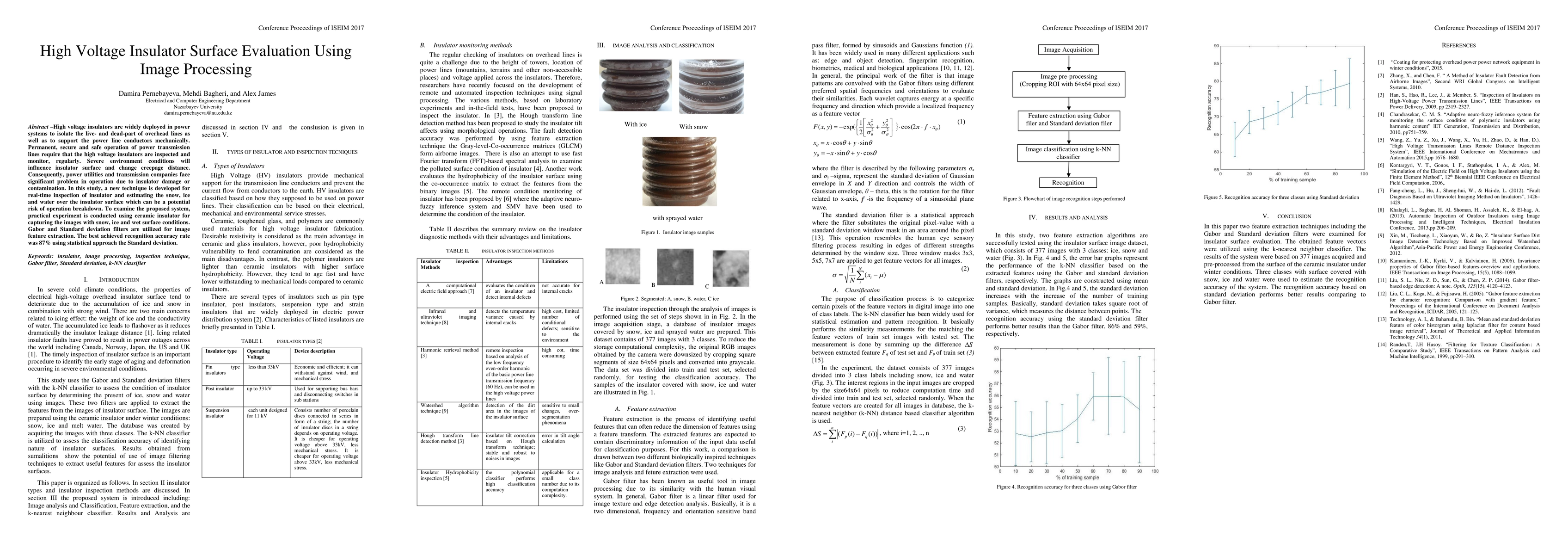 High voltage insulators are widely deployed in power systems to isolate the live- and dead-part of overhead lines as well as to support the power line conductors mechanically. Permanent, secure and safe operation of power transmission lines require that the high voltage insulators are inspected and monitor, regularly. Severe environment conditions will influence insulator surface and change creepage distance. Consequently, power utilities and transmission companies face significant problem in operation due to insulator damage or contamination. In this study, a new technique is developed for real-time inspection of insulator and estimating the snow, ice and water over the insulator surface which can be a potential risk of operation breakdown. To examine the proposed system, practical experiment is conducted using ceramic insulator for capturing the images with snow, ice and wet surface conditions. Gabor and Standard deviation filters are utilized for image feature extraction. The best achieved recognition accuracy rate was 87% using statistical approach the Standard deviation.