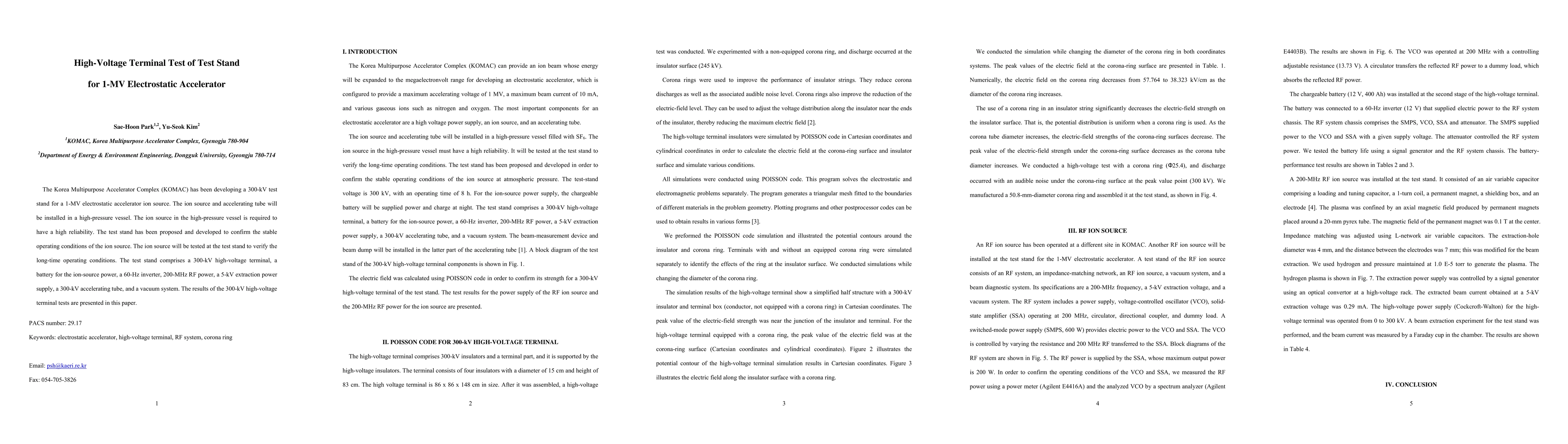 The Korea Multipurpose Accelerator Complex (KOMAC) has been developing a 300-kV test stand for a 1-MV electrostatic accelerator ion source. The ion source and accelerating tube will be installed in a high-pressure vessel. The ion source in the high-pressure vessel is required to have a high reliability. The test stand has been proposed and developed to confirm the stable operating conditions of the ion source. The ion source will be tested at the test stand to verify the long-time operating conditions. The test stand comprises a 300-kV high-voltage terminal, a battery for the ion-source power, a 60-Hz inverter, 200-MHz RF power, a 5-kV extraction power supply, a 300-kV accelerating tube, and a vacuum system. The results of the 300-kV high-voltage terminal tests are presented in this paper.