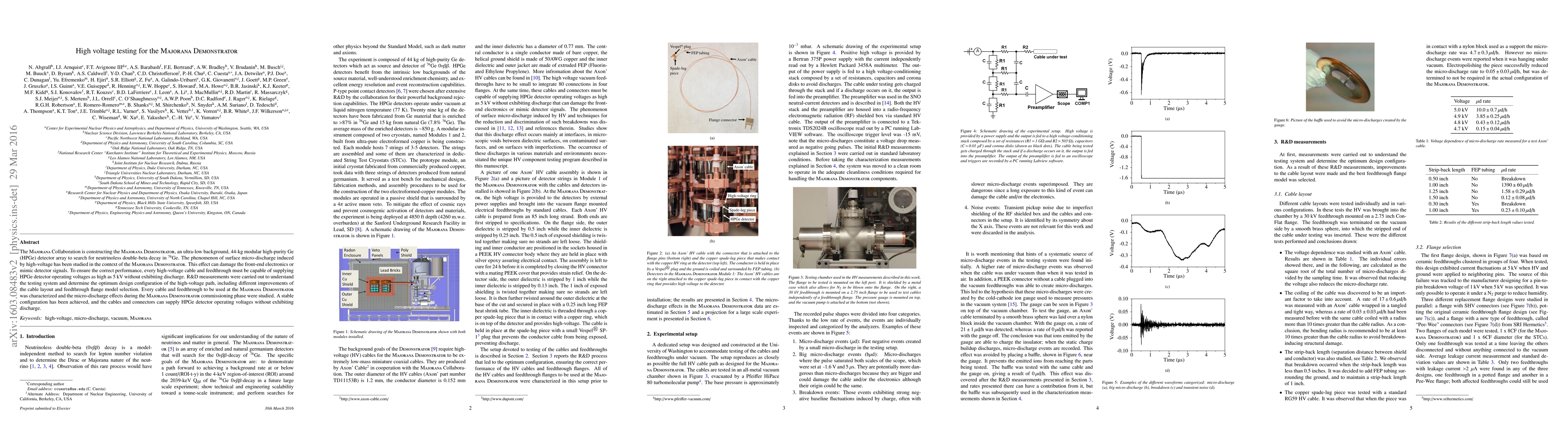 The MAJORANA Collaboration tested high-voltage components for the MAJORANA Demonstrator, a 44-kg Ge detector array, to prevent surface micro-discharges that could damage electronics or mimic signals. Optimized designs were developed for high-voltage cables and feedthroughs to ensure they can supply up to 5 kV without discharge, achieving a stable configuration for the detector's operation.