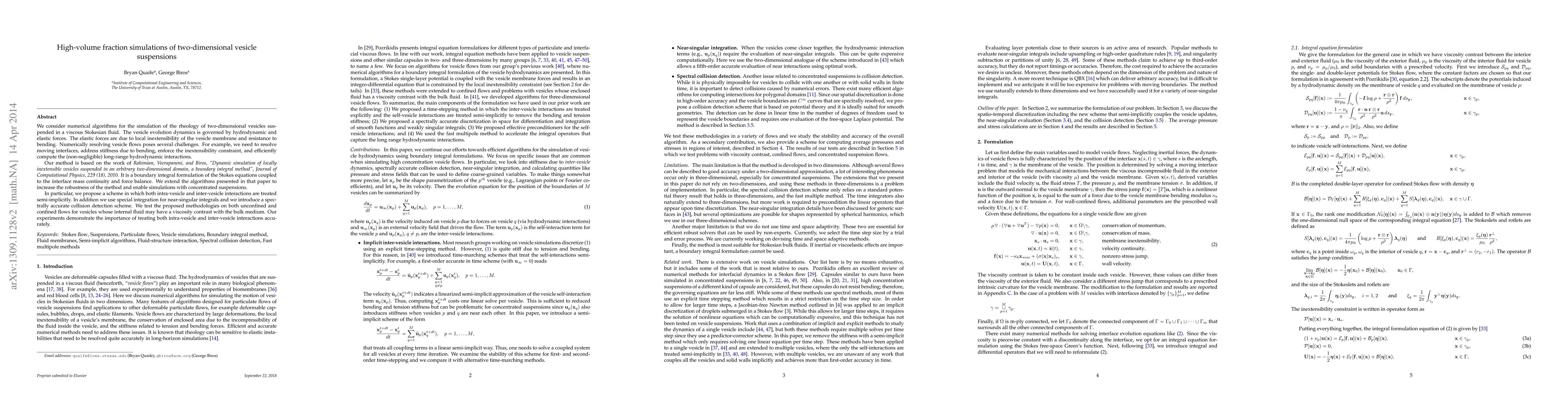 We consider numerical algorithms for the simulation of the rheology of two-dimensional vesicles suspended in a viscous Stokesian fluid. The vesicle evolution dynamics is governed by hydrodynamic and elastic forces. The elastic forces are due to local inextensibility of the vesicle membrane and resistance to bending. Numerically resolving vesicle flows poses several challenges. For example, we need to resolve moving interfaces, address stiffness due to bending, enforce the inextensibility constraint, and efficiently compute the (non-negligible) long-range hydrodynamic interactions. Our method is based on the work of {\em Rahimian, Veerapaneni, and Biros, "Dynamic simulation of locally inextensible vesicles suspended in an arbitrary two-dimensional domain, a boundary integral method", Journal of Computational Physics, 229 (18), 2010}. It is a boundary integral formulation of the Stokes equations coupled to the interface mass continuity and force balance. We extend the algorithms presented in that paper to increase the robustness of the method and enable simulations with concentrated suspensions. In particular, we propose a scheme in which both intra-vesicle and inter-vesicle interactions are treated semi-implicitly. In addition we use special integration for near-singular integrals and we introduce a spectrally accurate collision detection scheme. We test the proposed methodologies on both unconfined and confined flows for vesicles whose internal fluid may have a viscosity contrast with the bulk medium. Our experiments demonstrate the importance of treating both intra-vesicle and inter-vesicle interactions accurately.
