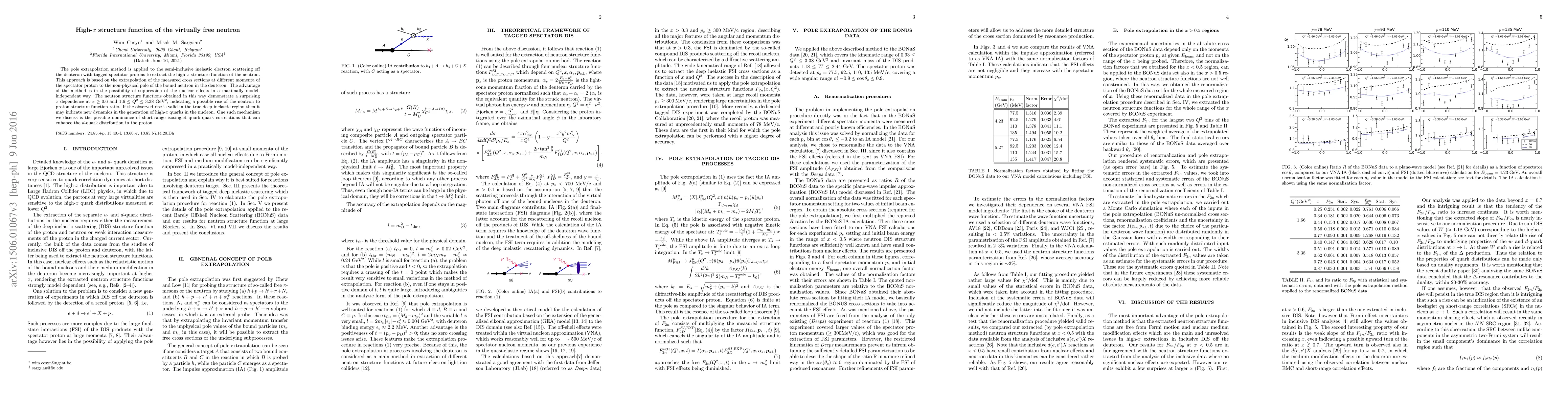 The pole extrapolation method is applied to the semi-inclusive inelastic electron scattering off the deuteron with tagged spectator protons to extract the high-x structure function of the neutron. This approach is based on the extrapolation of the measured cross sections at different momenta of the spectator proton to the non-physical pole of the bound neutron in the deuteron. The advantage of the method is in the possibility of suppression of the nuclear effects in a maximally model-independent way. The neutron structure functions obtained in this way demonstrate a surprising x dependence at $x\ge 0.6$ and $1.6 \leq Q^2 \leq 3.38$ GeV$^2$, indicating a possible rise of the neutron to proton structure function ratio. If the observed rise is valid in the true deep inelastic region then it may indicate new dynamics in the generation of high-x quarks in the nucleon. One such mechanism we discuss is the possible dominance of short-range isosinglet quark-quark correlations that can enhance the d-quark distribution in the proton.
