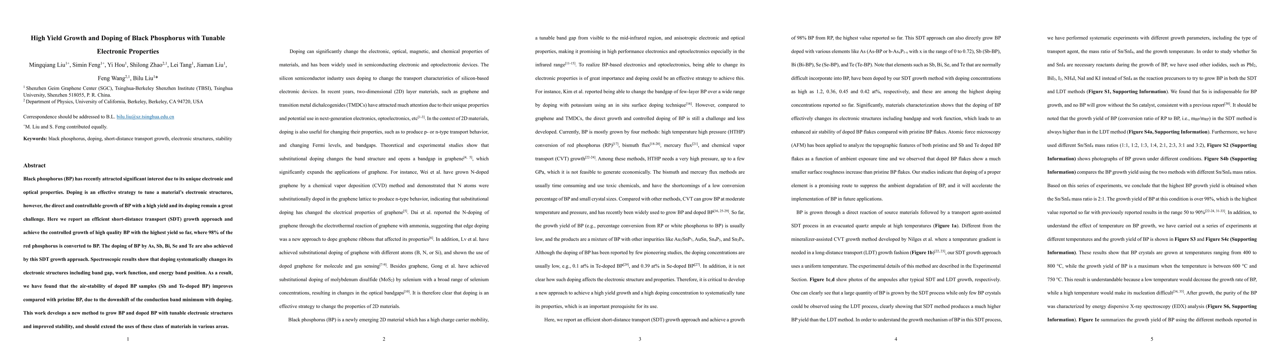 This paper presents a novel short-distance transport growth method achieving high-yield conversion of red phosphorus to black phosphorus (BP) with 98% efficiency. The study also successfully dopes BP with As, Sb, Bi, Se, and Te, altering its electronic properties and improving the air stability of Sb and Te-doped BP.