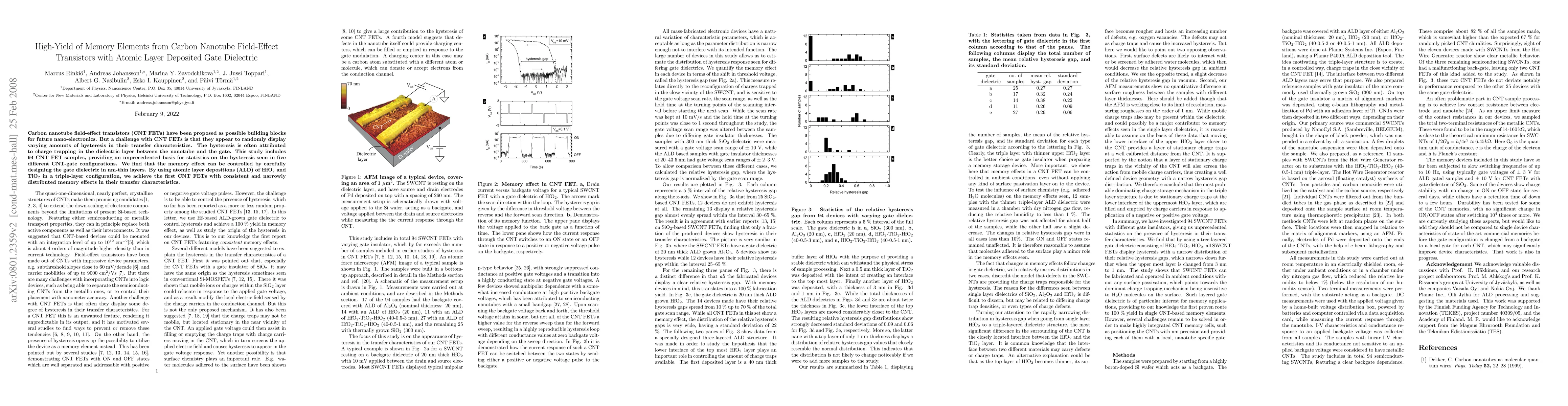 This study investigates the hysteresis in carbon nanotube field-effect transistors (CNT FETs) and demonstrates that it can be controlled by optimizing the gate dielectric using atomic layer deposition (ALD) of HfO$_{2}$ and TiO$_{2}$. The research shows consistent and narrowly distributed memory effects in CNT FETs with a triple-layer gate dielectric configuration, overcoming previous variability issues.