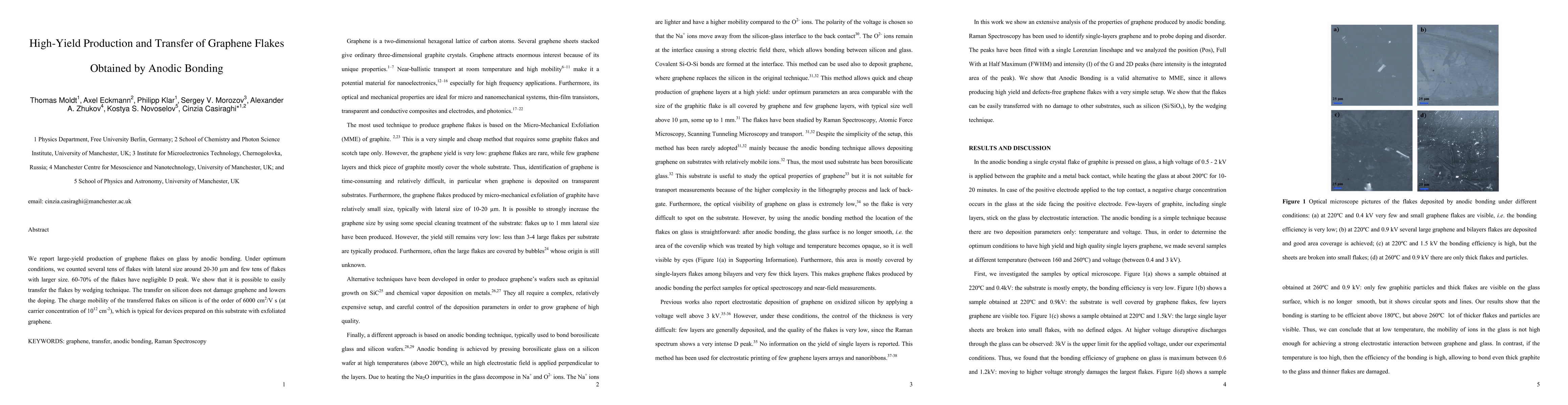 This paper details a high-yield production method for graphene flakes on glass using anodic bonding, achieving flakes with sizes up to 30 μm and minimal D peak, indicating high quality. The flakes can be efficiently transferred using a wedging technique without damaging the graphene, resulting in charge mobility of 6000 cm^2/V s on silicon substrates.