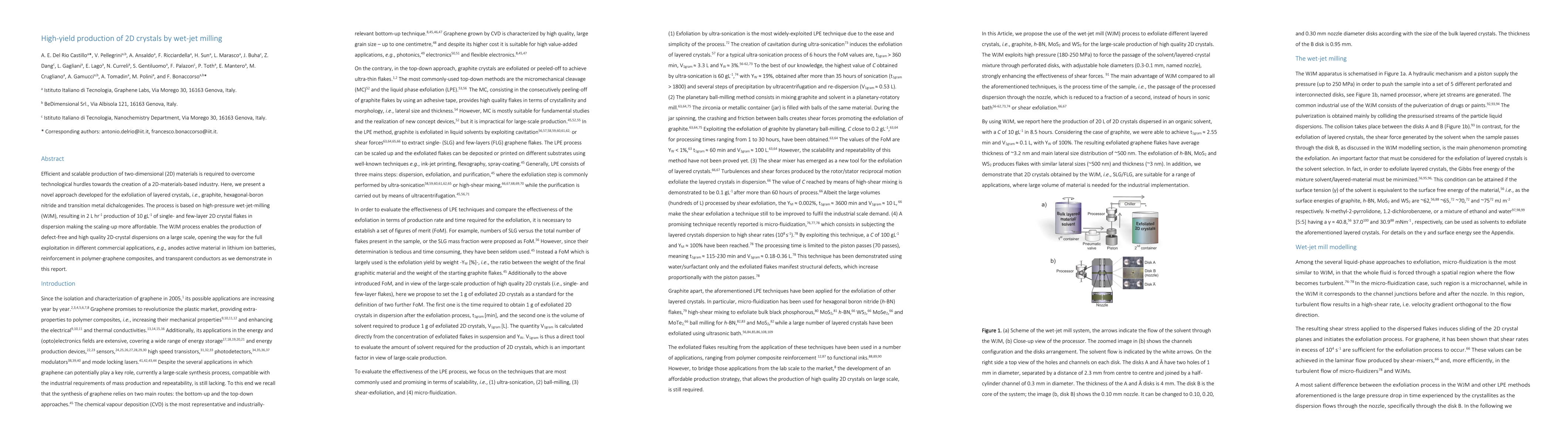 Efficient and scalable production of two-dimensional (2D) materials is required to overcome technological hurdles towards the creation of a 2D-materials-based industry. Here, we present a novel approach developed for the exfoliation of layered crystals, i.e., graphite, hexagonal boron nitride and transition metal dichalcogenides. The process is based on high-pressure wet-jet-milling (WJM), resulting in 2 L/hr production of 10 g/L of single- and few-layer 2D crystal flakes in dispersion making the scaling-up more affordable. The WJM process enables the production of defect-free and high-quality 2D-crystal dispersions on a large scale, opening the way for the full exploitation in different commercial applications, e.g., anodes active material in lithium ion batteries, reinforcement in polymer-graphene composites, and transparent conductors as we demonstrate in this report.