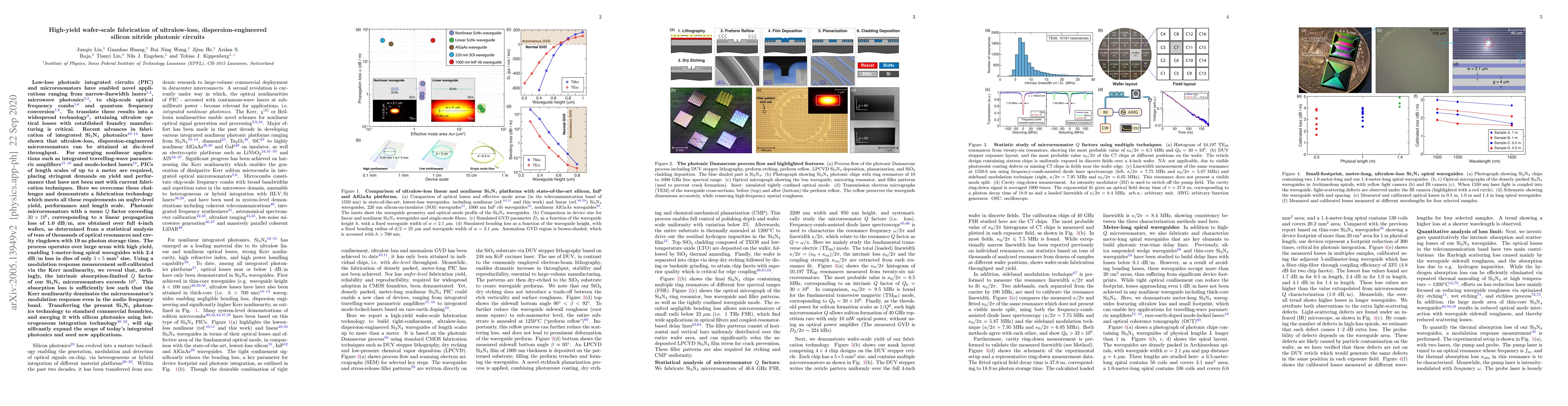 This paper presents a high-yield wafer-scale fabrication technique for ultralow-loss, dispersion-engineered silicon nitride photonic circuits, achieving mean Q factors over 30 million with linear propagation losses of 1.0 dB/m across 4-inch wafers. The technology enables 1-meter-long waveguides and suggests intrinsic absorption-limited Q factors exceeding a billion, paving the way for advanced nonlinear photonic applications.