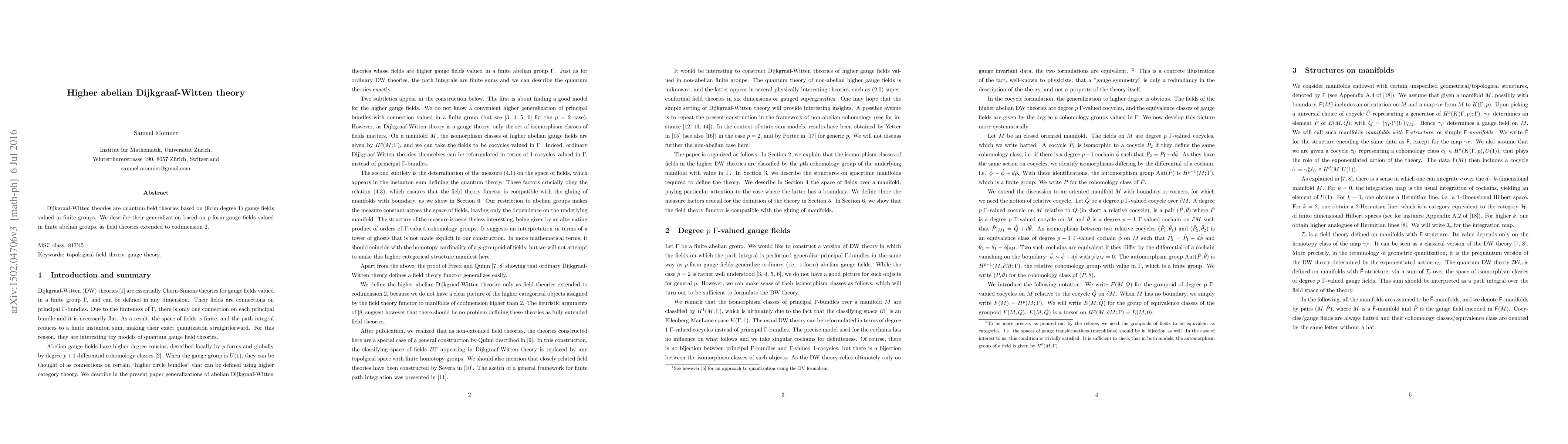 Summary: This paper generalizes Dijkgraaf-Witten theories to include $p$-form gauge fields valued in finite abelian groups, presenting these as quantum field theories extended to codimension 2. The focus is on higher abelian Dijkgraaf-Witten theory.