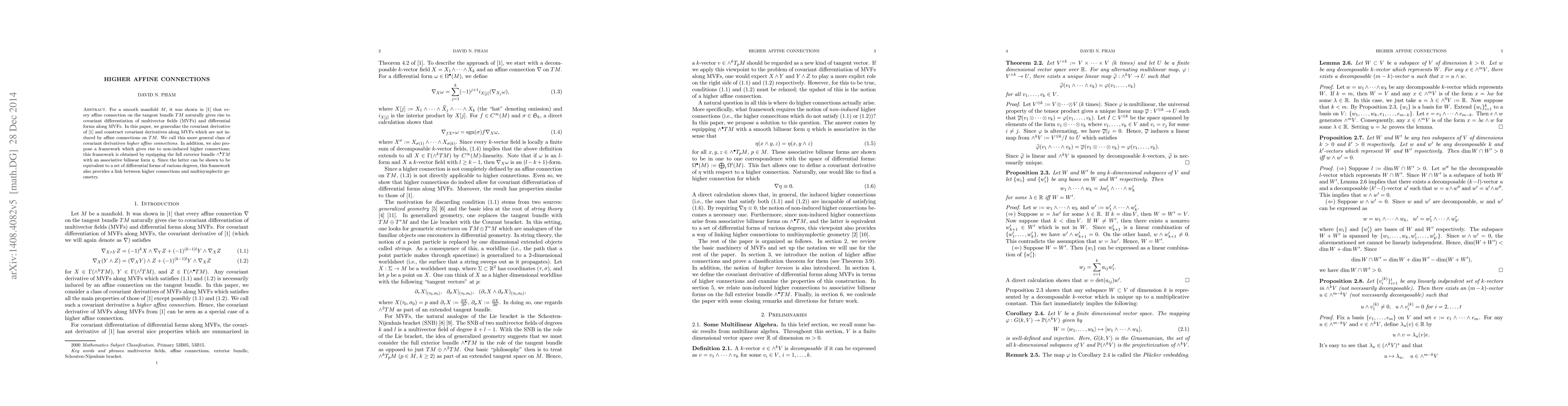 This paper generalizes the concept of affine connections to construct "higher affine connections" that allow covariant differentiation of multivector fields and differential forms without being induced by traditional affine connections on $TM$. It introduces a framework using an associative bilinear form on the exterior bundle to establish a connection to multisymplectic geometry.