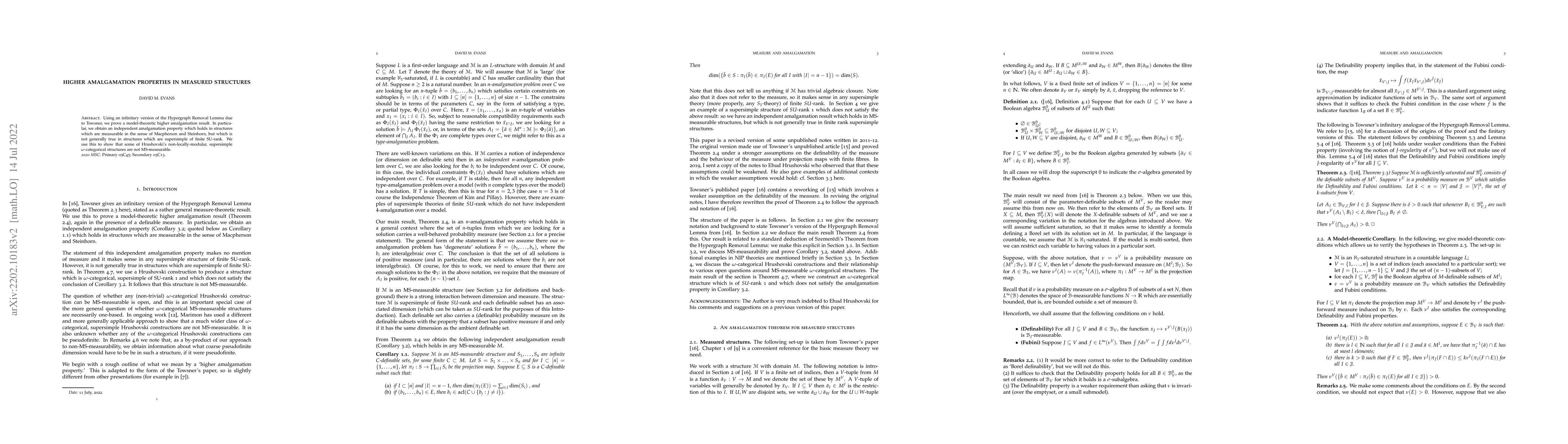 This paper proves a higher amalgamation property in measurable structures using an infinitary Hypergraph Removal Lemma, demonstrating that such structures can achieve independence amalgamation, which does not generally hold in supersimple structures with finite SU-rank. It also shows that certain Hrushovski structures are not MS-measurable.