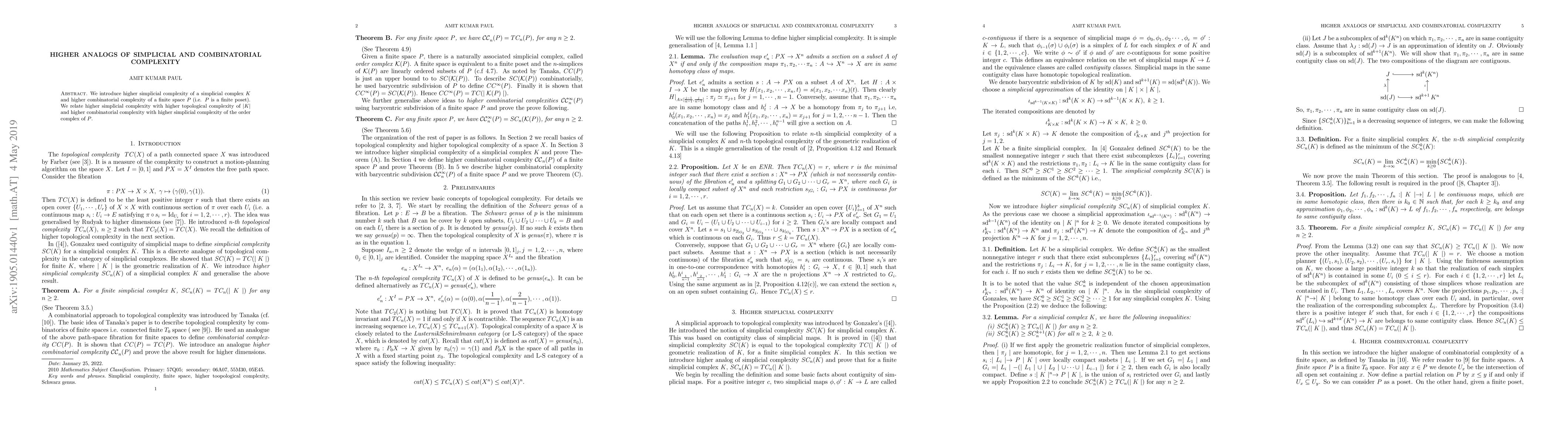 We introduce higher simplicial complexity of a simplicial complex $K$ and higher combinatorial complexity of a finite space $P$ (i.e. $P$ is a finite poset). We relate higher simplicial complexity with higher topological complexity of $|K|$ and higher combinatorial complexity with higher simplicial complexity of the order complex of $P$.