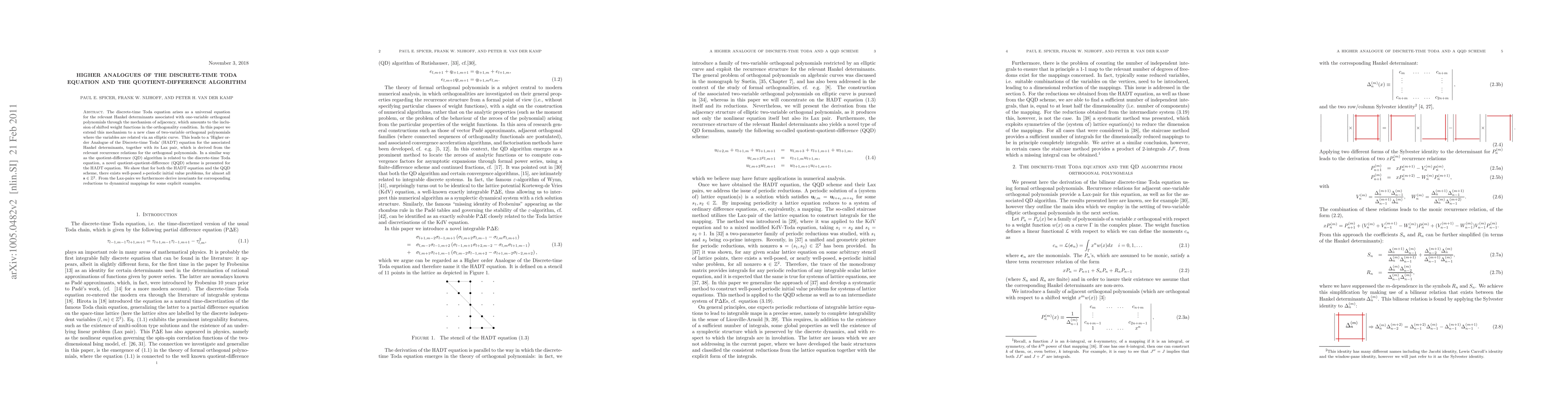 The discrete-time Toda equation arises as a universal equation for the relevant Hankel determinants associated with one-variable orthogonal polynomials through the mechanism of adjacency, which amounts to the inclusion of shifted weight functions in the orthogonality condition. In this paper we extend this mechanism to a new class of two-variable orthogonal polynomials where the variables are related via an elliptic curve. This leads to a `Higher order Analogue of the Discrete-time Toda' (HADT) equation for the associated Hankel determinants, together with its Lax pair, which is derived from the relevant recurrence relations for the orthogonal polynomials. In a similar way as the quotient-difference (QD) algorithm is related to the discrete-time Toda equation, a novel quotient-quotient-difference (QQD) scheme is presented for the HADT equation. We show that for both the HADT equation and the QQD scheme, there exists well-posed $s$-periodic initial value problems, for almost all $\s\in\Z^2$. From the Lax-pairs we furthermore derive invariants for corresponding reductions to dynamical mappings for some explicit examples.