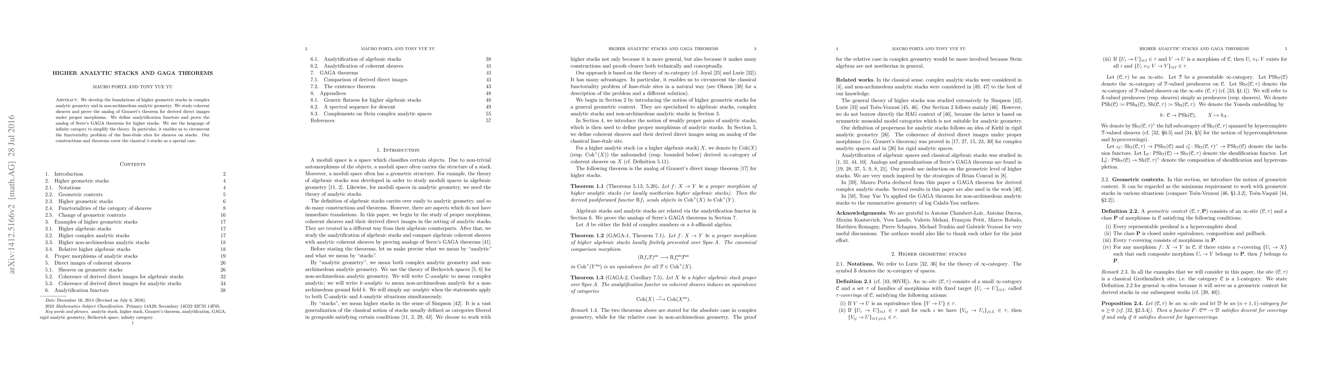 This paper lays the foundation for higher geometric stacks in both complex and non-archimedean analytic geometry, proving analogs of Grauert's and Serre's theorems using the language of infinity categories to address functoriality issues. The work generalizes classical 1-stack results.