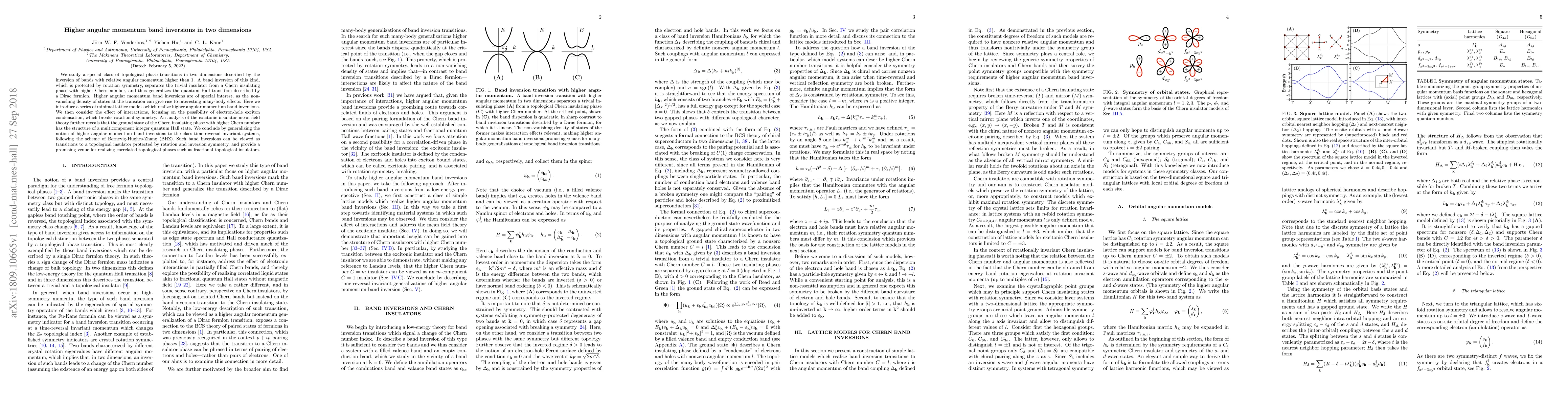 We study a special class of topological phase transitions in two dimensions described by the inversion of bands with relative angular momentum higher than 1. A band inversion of this kind, which is protected by rotation symmetry, separates the trivial insulator from a Chern insulating phase with higher Chern number, and thus generalizes the quantum Hall transition described by a Dirac fermion. Higher angular momentum band inversions are of special interest, as the non-vanishing density of states at the transition can give rise to interesting many-body effects. Here we introduce a series of minimal lattice models which realize higher angular momentum band inversions. We then consider the effect of interactions, focusing on the possibility of electron-hole exciton condensation, which breaks rotational symmetry. An analysis of the excitonic insulator mean field theory further reveals that the ground state of the Chern insulating phase with higher Chern number has the structure of a multicomponent integer quantum Hall state. We conclude by generalizing the notion of higher angular momentum band inversions to the class time-reversal invariant systems, following the scheme of Bernevig-Hughes-Zhang (BHZ). Such band inversions can be viewed as transitions to a topological insulator protected by rotation and inversion symmetry, and provide a promising venue for realizing correlated topological phases such as fractional topological insulators.