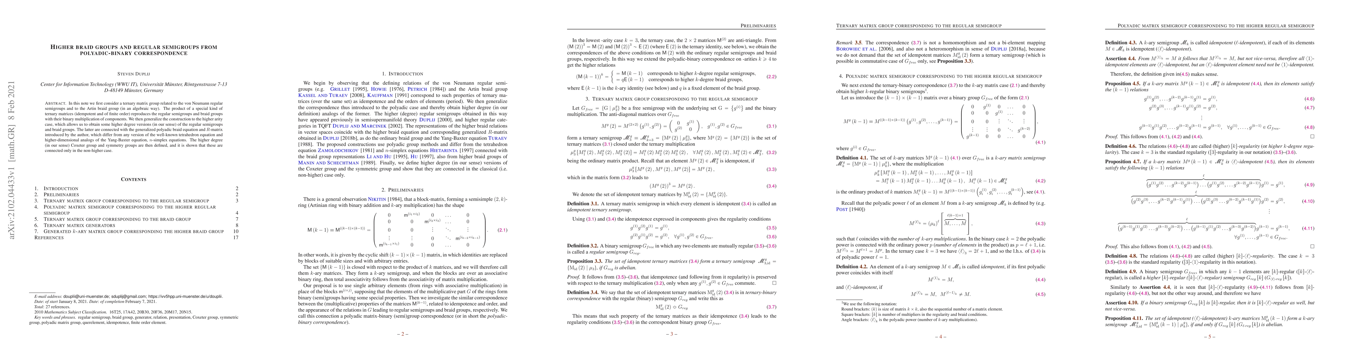 In this note we first consider a ternary matrix group related to the von Neumann regular semigroups and to the Artin braid group (in an algebraic way). The product of a special kind of ternary matrices (idempotent and of finite order) reproduces the regular semigroups and braid groups with their binary multiplication of components. We then generalize the construction to the higher arity case, which allows us to obtain some higher degree versions (in our sense) of the regular semigroups and braid groups. The latter are connected with the generalized polyadic braid equation and $R$-matrix introduced by the author, which differ from any version of the well-known tetrahedron equation and higher-dimensional analogs of the Yang-Baxter equation, $n$-simplex equations. The higher degree (in our sense) Coxeter group and symmetry groups are then defined, and it is shown that these are connected only in the non-higher case.