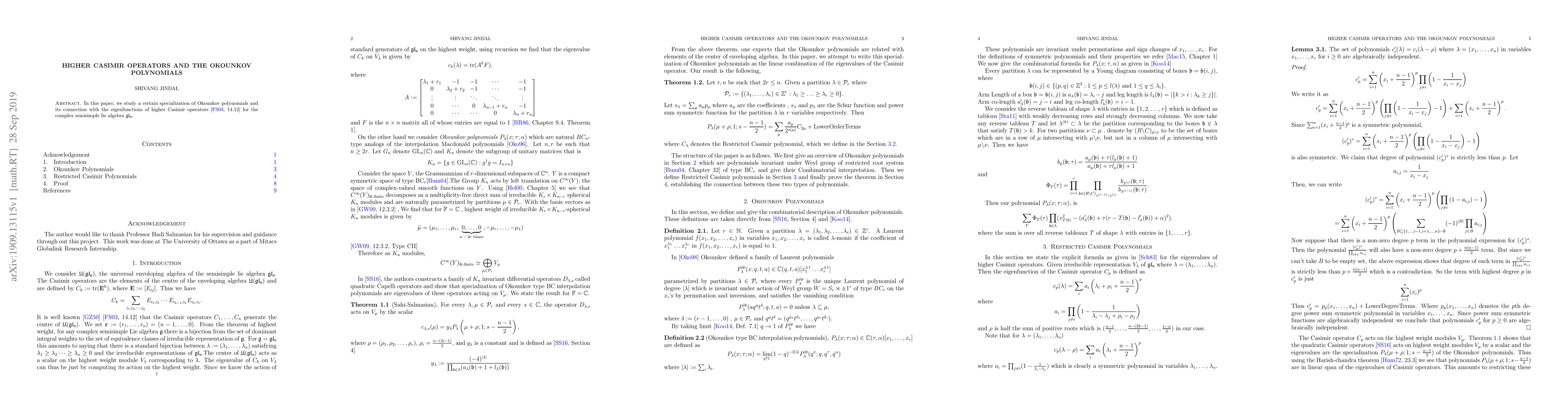 This paper investigates a specialized form of Okounkov polynomials and demonstrates its relationship with eigenfunctions derived from higher Casimir operators within the complex semi-simple Lie algebra gl_n. The study provides deeper insights into the algebraic structures underpinning these mathematical objects.