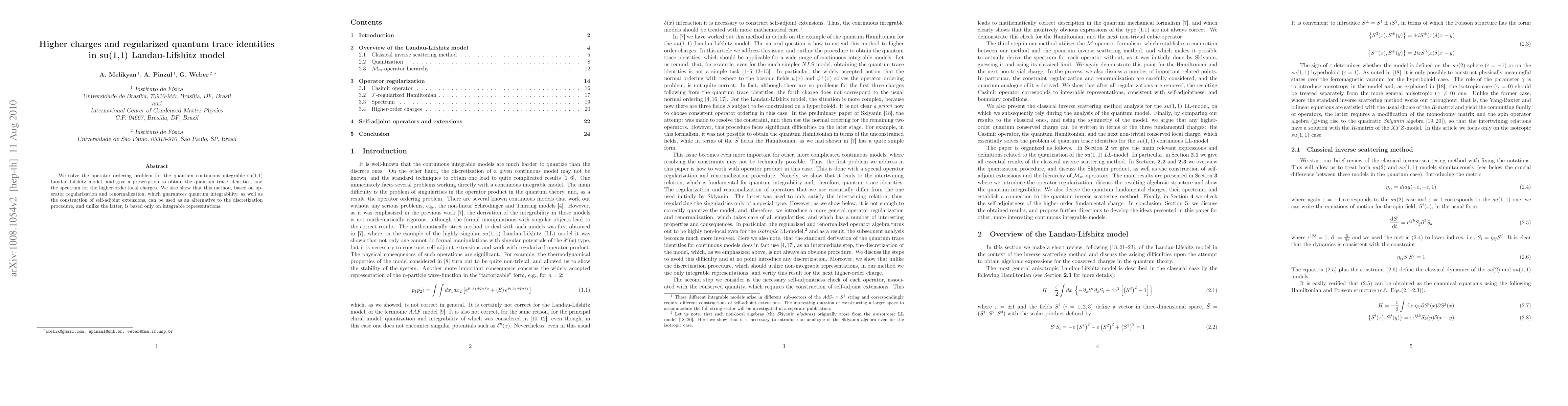 We solve the operator ordering problem for the quantum continuous integrable su(1,1) Landau-Lifshitz model, and give a prescription to obtain the quantum trace identities, and the spectrum for the higher-order local charges. We also show that this method, based on operator regularization and renormalization, which guarantees quantum integrability, as well as the construction of self-adjoint extensions, can be used as an alternative to the discretization procedure, and unlike the latter, is based only on integrable representations.
