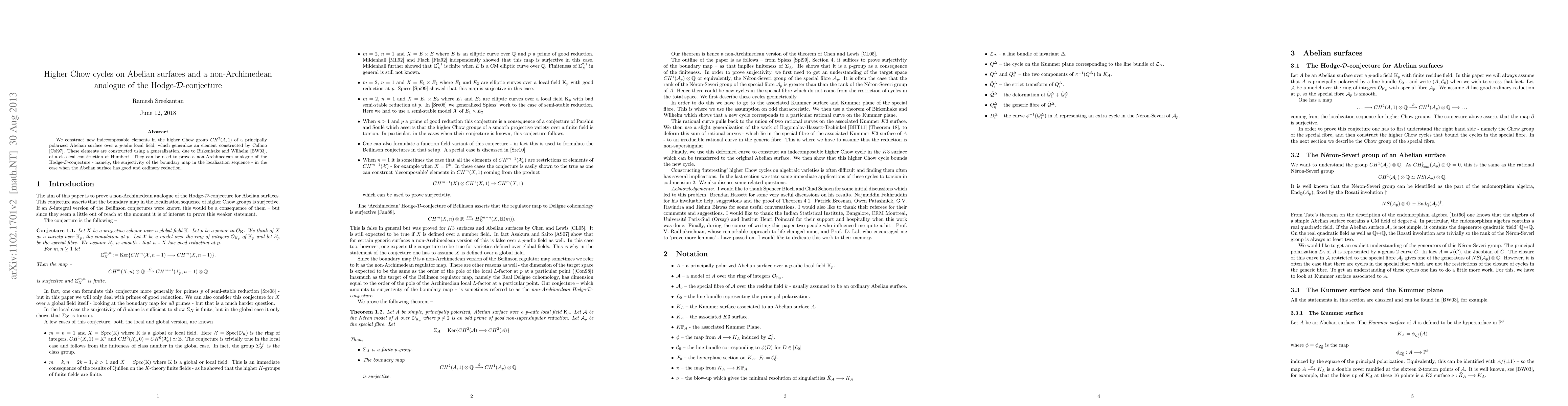 This paper constructs new indecomposable elements in the higher Chow group of an Abelian surface over a non-Archimedean local field, generalizing Collino's element. It proves the non-Archimedean Hodge-D-conjecture for Abelian surfaces with good and ordinary reduction.