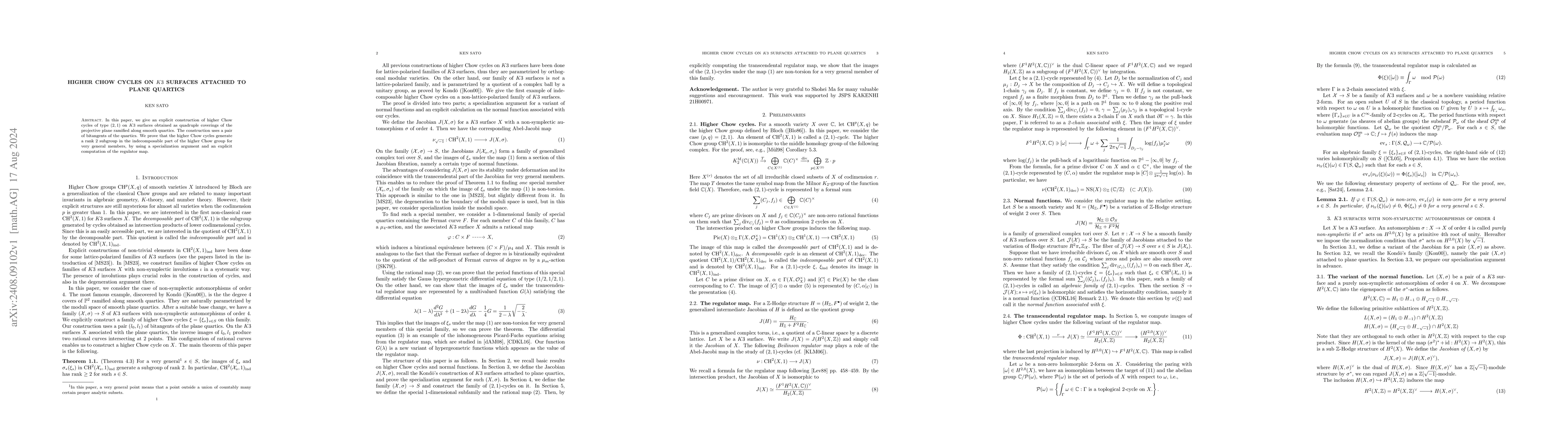 This paper constructs higher Chow cycles of type $(2,1)$ on $K3$ surfaces derived from quadruple coverings of the projective plane along smooth quartics, using bitangents. It demonstrates these cycles generate a rank 2 subgroup in the indecomposable part of the higher Chow group for general members via specialization and regulator computation.