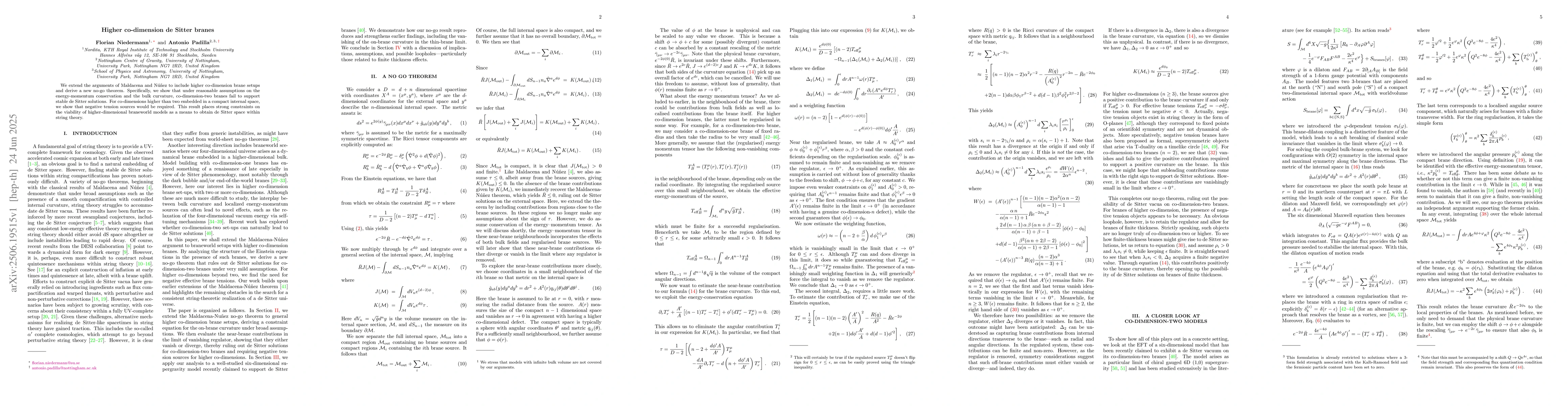 The paper extends previous work to show that higher co-dimension branes, under reasonable assumptions, cannot support stable de Sitter solutions. Co-dimension-two branes fail without negative tension, and for higher co-dimensions in compact spaces, negative tension sources are required, limiting the viability of braneworld models for generating de Sitter space in string theory.