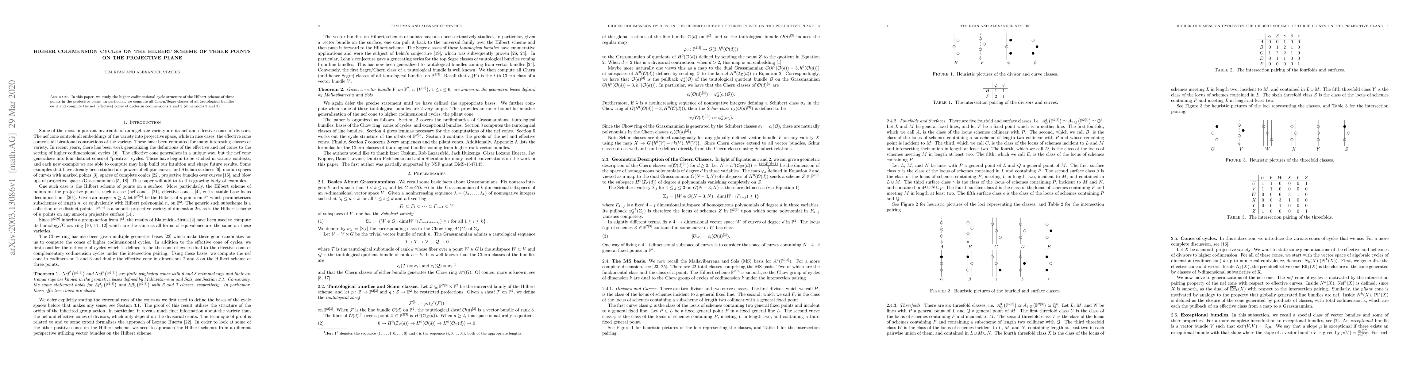 This paper investigates the higher codimensional cycles on the Hilbert scheme of three points in the projective plane, calculating all Chern and Segre classes of tautological bundles and determining the nef cones for cycles in dimensions 2 and 3.