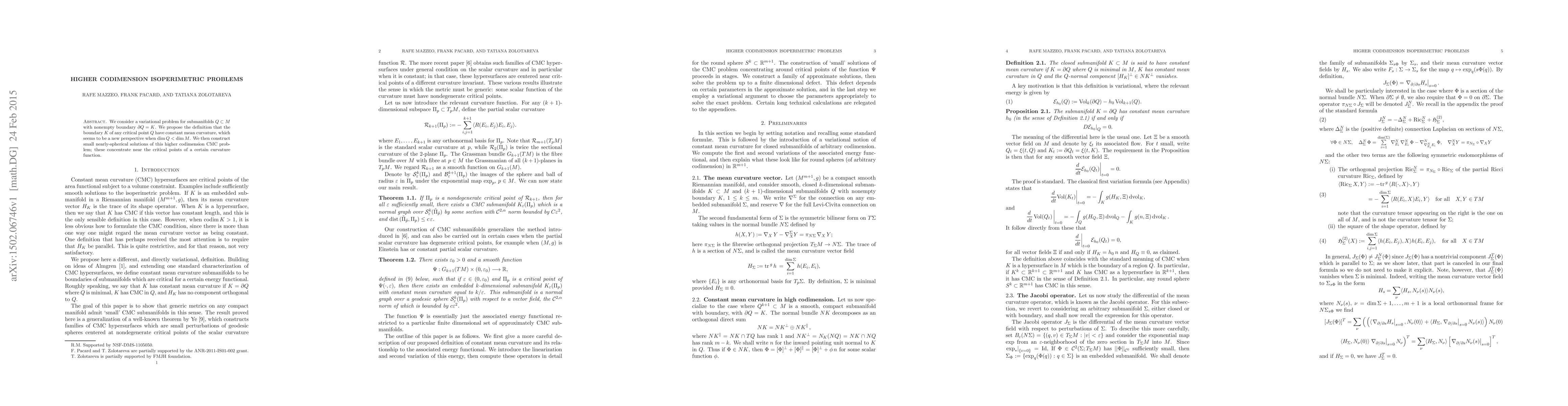 Researchers propose a new definition for critical points in submanifolds with nonempty boundary, focusing on constant mean curvature and constructing nearly-spherical solutions to the higher codimension isoperimetric problem.