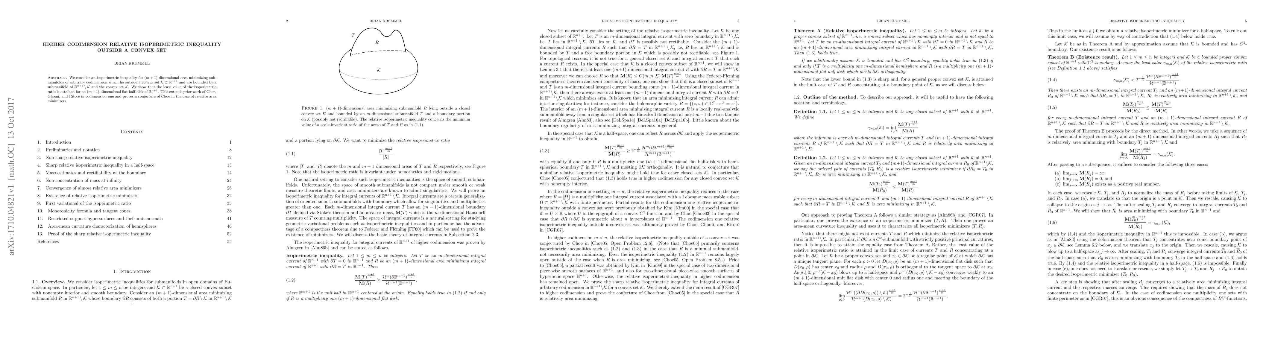 We consider an isoperimetric inequality for $(m+1)$-dimensional area minimizing submanifolds of arbitrary codimension which lie outside a convex set $\mathcal{K} \subset \mathbb{R}^{n+1}$ and are bounded by a submanifold of $\mathbb{R}^{n+1} \setminus \mathcal{K}$ and the convex set $\mathcal{K}$. We show that the least value of the isoperimetric ratio is attained for an $(m+1)$-dimensional flat half-disk of $\mathbb{R}^{n+1}_+$. This extends prior work of Choe, Ghomi, and Ritor\'{e} in codimension one and proves a conjecture of Choe in the case of relative area minimizers.