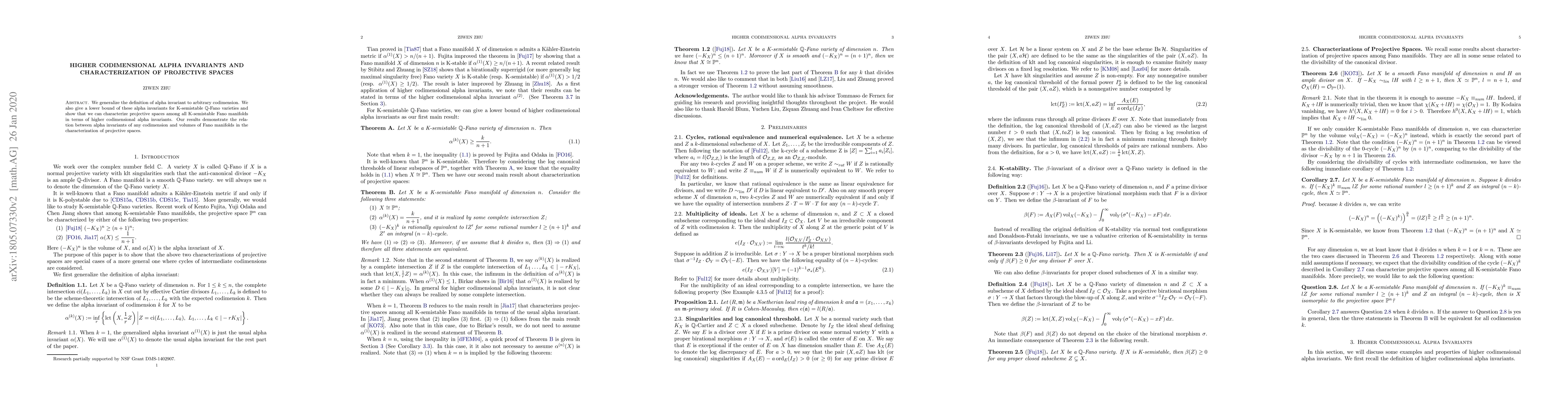 This paper generalizes the alpha invariant to higher codimensions and establishes a lower bound for K-semistable Q-Fano varieties, revealing that projective spaces can be uniquely characterized among K-semistable Fano manifolds via these higher codimensional alpha invariants. The findings illustrate a connection between these invariants and the volumes of Fano manifolds.