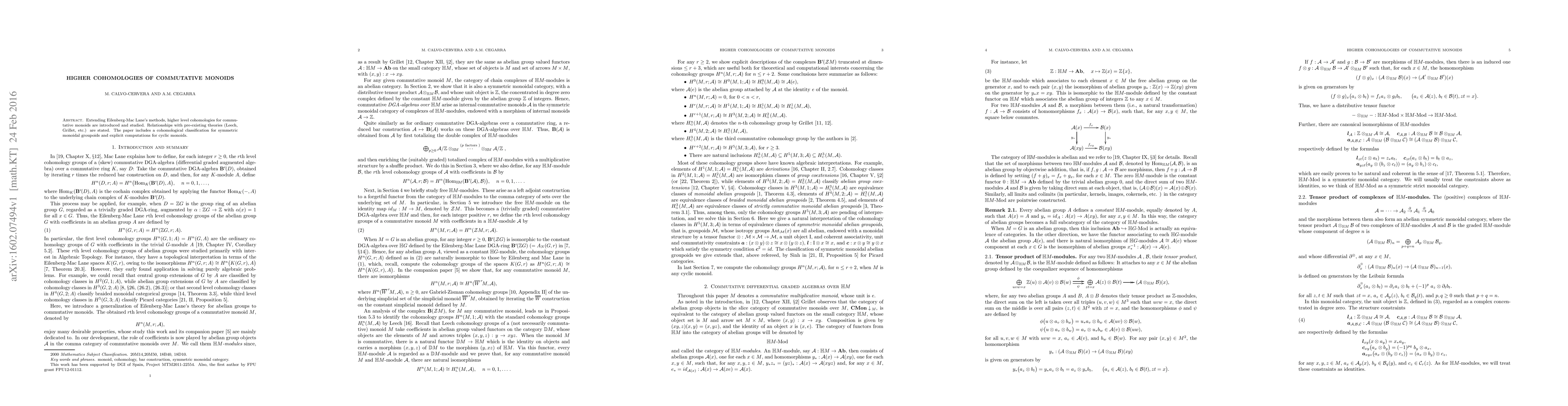 This paper introduces higher cohomologies for commutative monoids using extended Eilenberg-Mac Lane methods, and explores their connections to existing theories. It also provides a cohomological classification for symmetric monoidal groupoids and computes cohomologies for cyclic monoids.