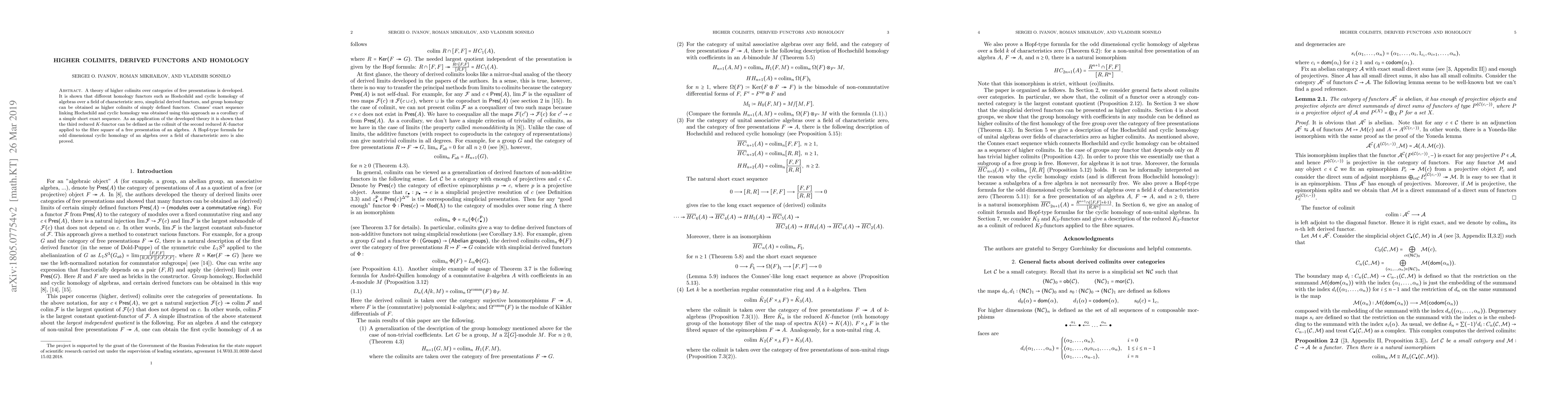 This paper develops a theory of higher colimits for categories of free presentations, showing that various homology functors like Hochschild and cyclic homology, simplicial derived functors, and group homology can be derived from these colimits. It uses this framework to prove Connes' exact sequence and establishes a Hopf-type formula for odd-dimensional cyclic homology.