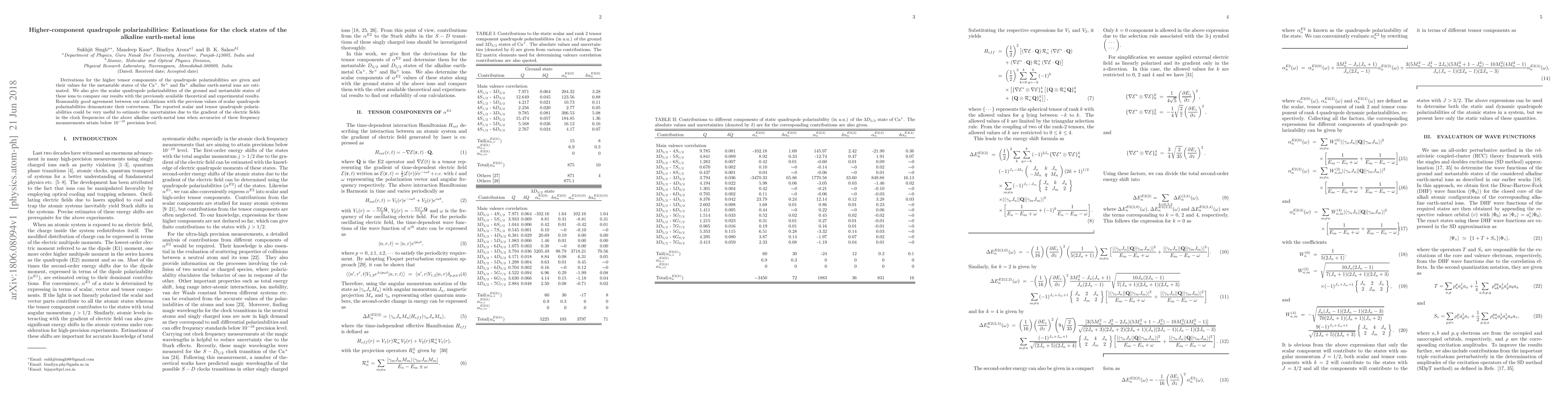 Derivations for the higher tensor components of the quadrupole polarizabilities are given and their values for the metastable states of the Ca$^+$, Sr$^+$ and Ba$^+$ alkaline earth-metal ions are estimated. We also give the scalar quadrupole polarizabilities of the ground and metastable states of these ions to compare our results with the previously available theoretical and experimental results. Reasonably good agreement between our calculations with the previous values of scalar quadrupole polarizabilities demonstrate their correctness. The reported scalar and tensor quadrupole polarizabilities could be very useful to estimate the uncertainties due to the gradient of the electric fields in the clock frequencies of the above alkaline earth-metal ions when accuracies of these frequency measurements attain below 10$^{-19}$ precision level.