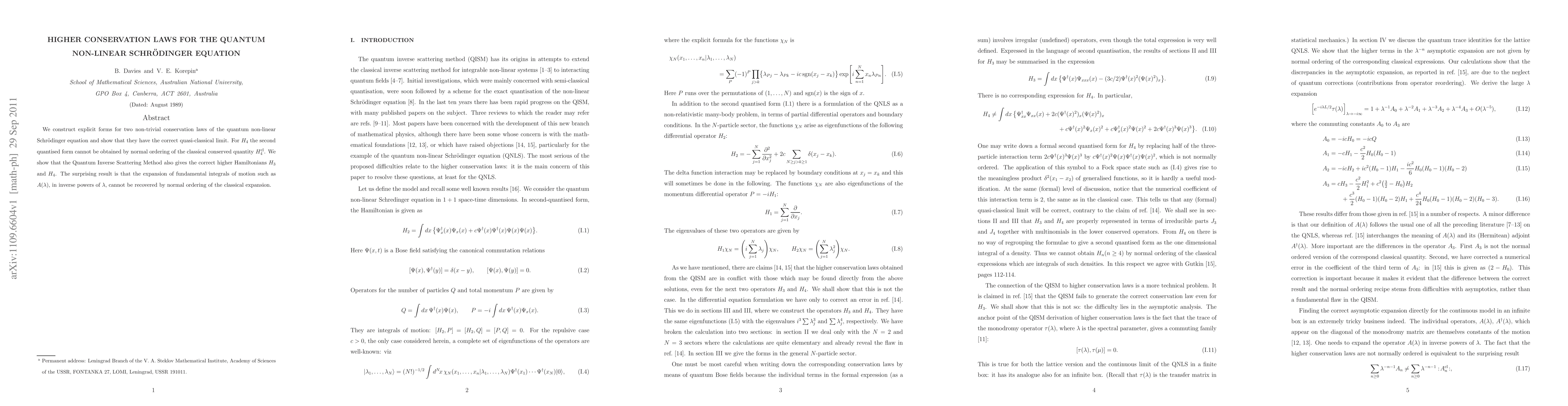 The paper discusses the conservation laws of the quantum non-linear Schrödinger equation, equivalent to the Lieb-Liniger model, which were originally identified in 1989. These laws have been recently applied to evaluate the three-body recombination rate in interacting quantum bosonic gases.