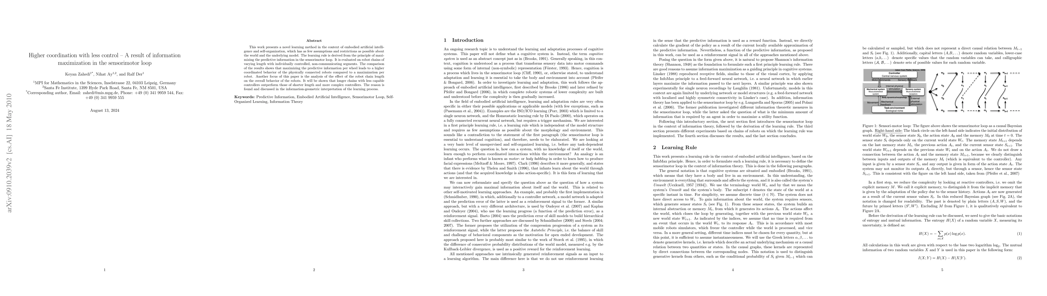 This paper introduces a learning method for embodied AI that maximizes predictive information in the sensorimotor loop, leading to higher coordination among non-communicating robot segments. The study finds that longer robot chains with less capable controllers achieve better coordination than shorter chains with more complex controllers, explained through an information-geometric interpretation.