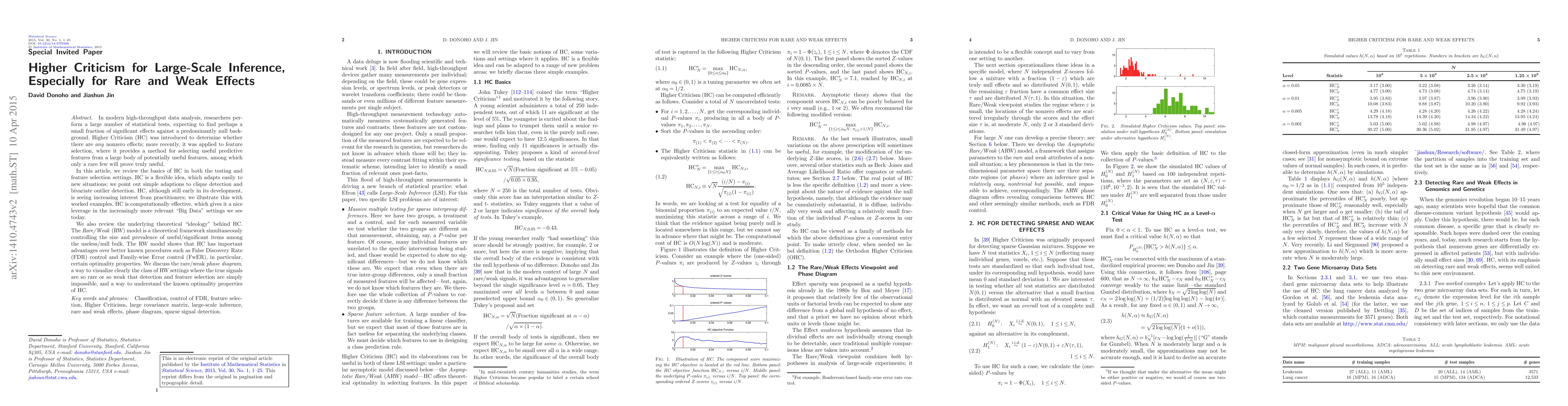 This paper reviews Higher Criticism (HC) for large-scale inference, particularly its application to rare and weak effects, highlighting its advantages over other procedures like False Discovery Rate control and Family-wise Error control.