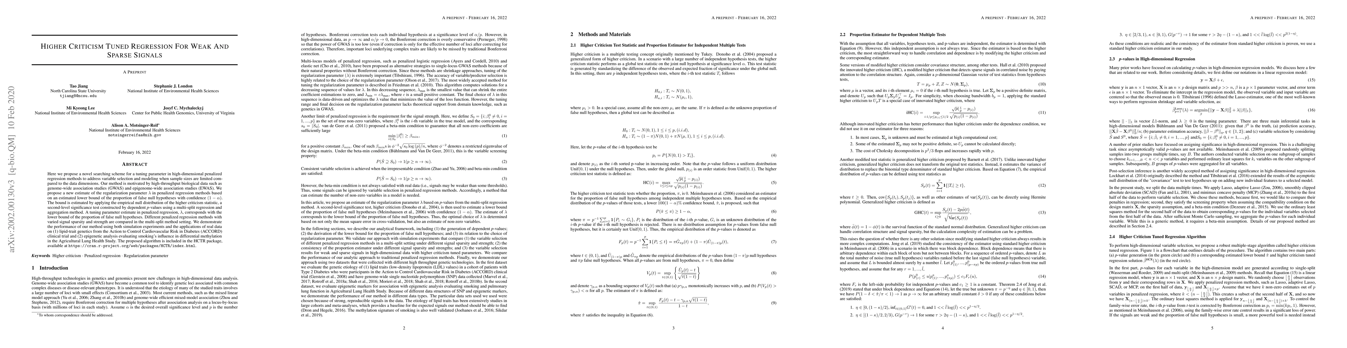 Here we propose a novel searching scheme for a tuning parameter in high-dimensional penalized regression methods to address variable selection and modeling when sample sizes are limited compared to the data dimensions. Our method is motivated by high-throughput biological data such as genome-wide association studies (GWAS) and epigenome-wide association studies (EWAS). We propose a new estimate of the regularization parameter $\lambda$ in penalized regression methods based on an estimated lower bound of the proportion of false null hypotheses with confidence $(1 - \alpha)$. The bound is estimated by applying the empirical null distribution of the higher criticism statistic, a second-level significance test constructed by dependent $p$-values using a multi-split regression and aggregation method. A tuning parameter estimate in penalized regression, $\lambda$, corresponds with the lower bound of the proportion of false null hypotheses. Different penalized regression methods with varied signal sparsity and strength are compared in the multi-split method setting. We demonstrate the performance of our method using both simulation experiments and the applications of real data on (1) lipid-trait genetics from the Action to Control Cardiovascular Risk in Diabetes (ACCORD) clinical trial and (2) epigenetic analysis evaluating smoking's influence in differential methylation in the Agricultural Lung Health Study. The proposed algorithm is included in the HCTR package, available at https://cran.r-project.org/web/packages/HCTR/index.html.