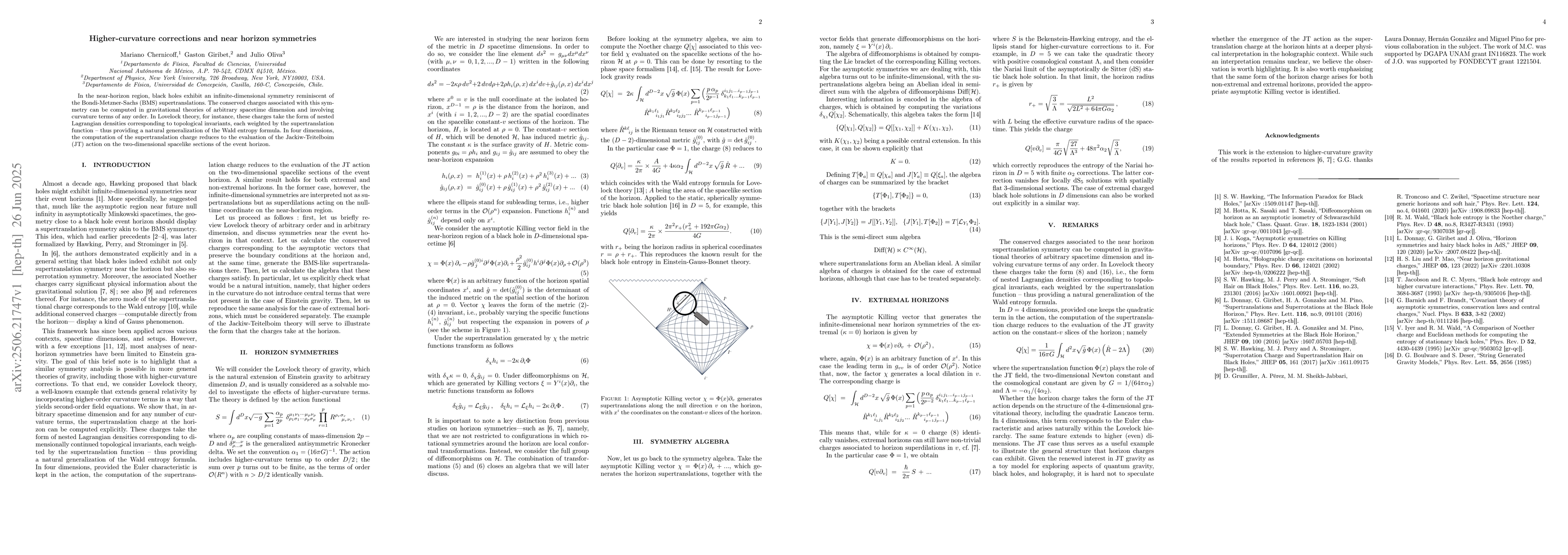 In the near-horizon region, black holes exhibit an infinite-dimensional symmetry reminiscent of the Bondi-Metzner-Sachs (BMS) supertranslations. The conserved charges associated with this symmetry can be computed in gravitational theories of arbitrary spacetime dimension and involving curvature terms of any order. In Lovelock theory, for instance, these charges take the form of nested Lagrangian densities corresponding to topological invariants, each weighted by the supertranslation function -- thus providing a natural generalization of the Wald entropy formula. In four dimensions, the computation of the supertranslation charge reduces to the evaluation of the Jackiw-Teitelboim (JT) action on the two-dimensional spacelike sections of the event horizon.