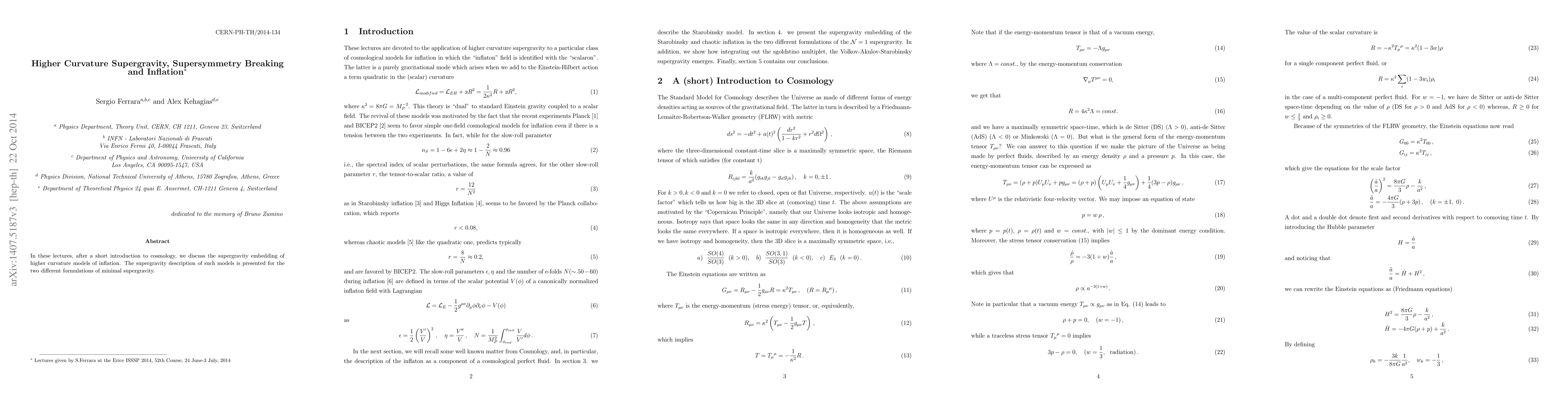 In these lectures, after a short introduction to cosmology, we discuss the supergravity embedding of higher curvature models of inflation. The supergravity description of such models is presented for the two different formulations of minimal supergravity.