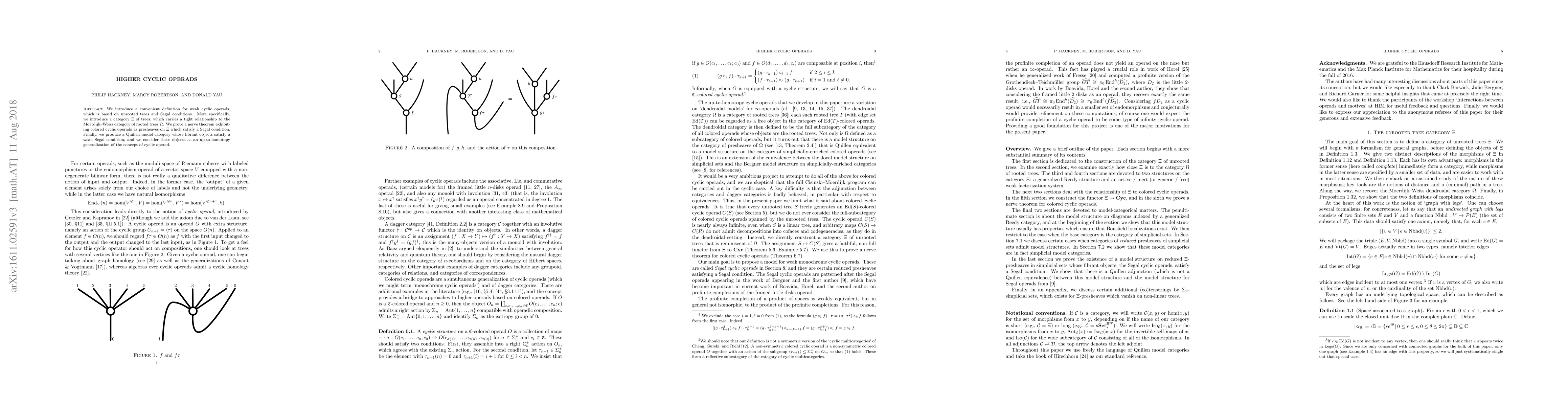 We introduce a convenient definition for weak cyclic operads, which is based on unrooted trees and Segal conditions. More specifically, we introduce a category $\Xi$ of trees, which carries a tight relationship to the Moerdijk-Weiss category of rooted trees $\Omega$. We prove a nerve theorem exhibiting colored cyclic operads as presheaves on $\Xi$ which satisfy a Segal condition. Finally, we produce a Quillen model category whose fibrant objects satisfy a weak Segal condition, and we consider these objects as an up-to-homotopy generalization of the concept of cyclic operad.