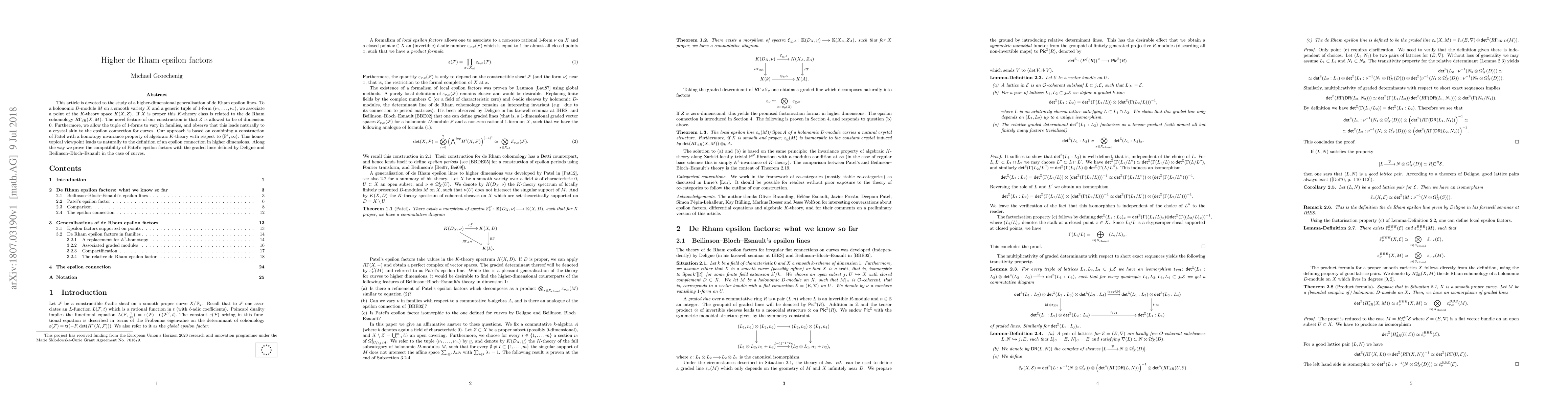 This paper generalizes de Rham epsilon lines to higher dimensions by associating points in $K$-theory to holonomic $D$-modules and families of $1$-forms on smooth varieties. It introduces a novel definition of epsilon connections in higher dimensions using homotopy invariance properties of algebraic $K$-theory and compatibility with existing graded lines for curves.