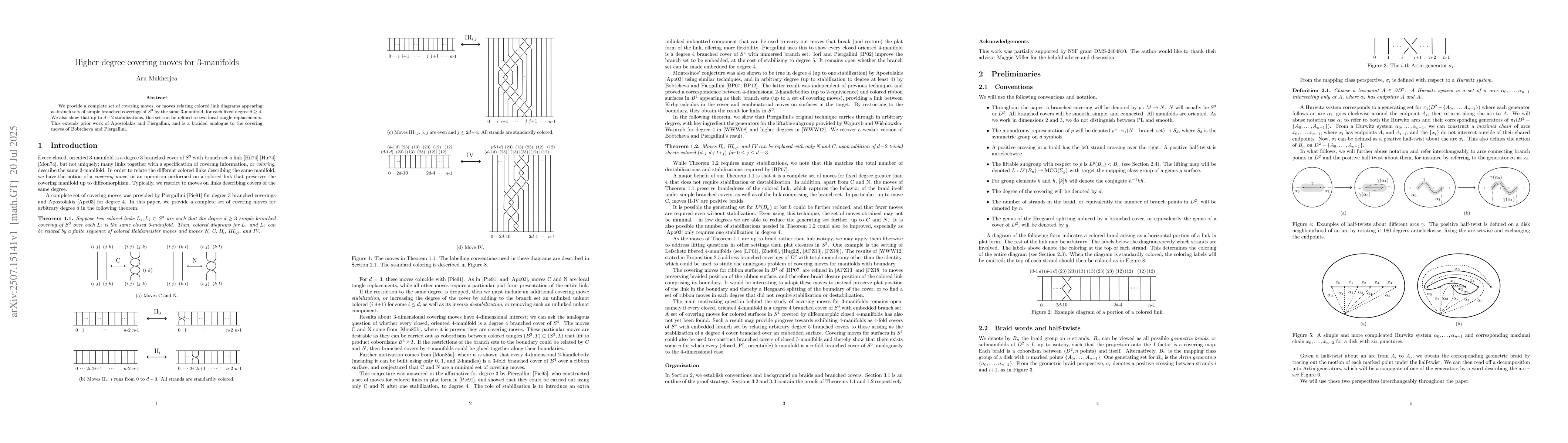 We provide a complete set of covering moves, or moves relating colored link diagrams appearing as branch sets of simple branched coverings of $S^3$ by the same 3-manifold, for each fixed degree $d \geq 4$. We also show that up to $d-2$ stabilizations, this set can be refined to two local tangle replacements. This extends prior work of Apostolakis and Piergallini, and is a braided analogue to the covering moves of Bobtcheva and Piergallini.