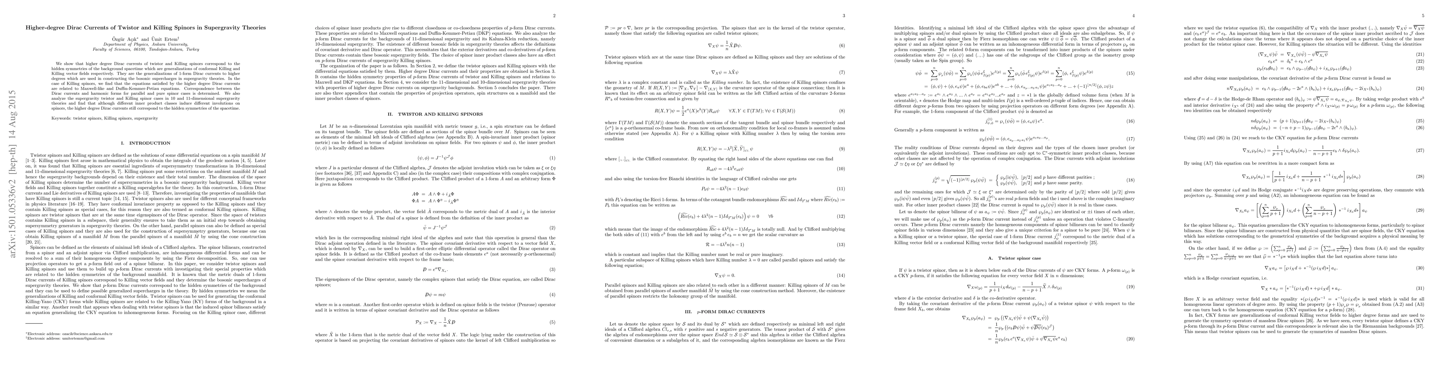 This paper explores higher-degree Dirac currents associated with twistor and Killing spinors in supergravity theories, revealing they correspond to hidden spacetime symmetries. It finds these currents generalize 1-form Dirac currents and relate to Maxwell-like and Duffin-Kemmer-Petiau equations, while maintaining correspondence with harmonic forms in parallel and pure spinor cases.