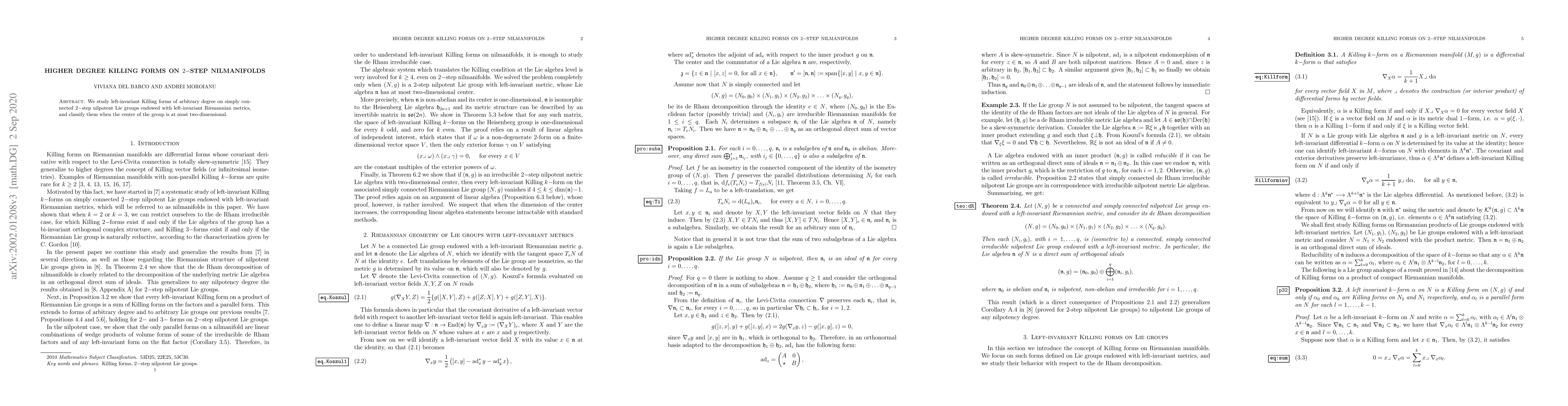 Summary: This paper investigates left-invariant Killing forms of any degree on simply connected 2-step nilpotent Lie groups with left-invariant Riemannian metrics, classifying them when the group's center has dimension at most two.