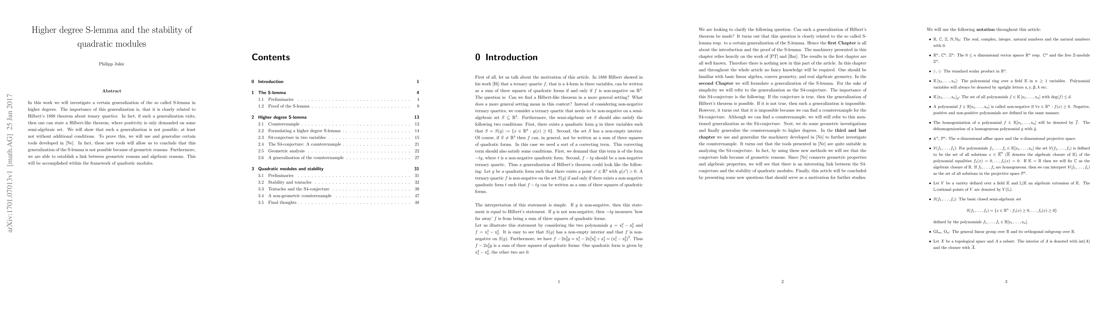 Researchers investigated a generalization of the S-lemma in higher degrees, finding it cannot exist without additional conditions. They used geometric tools to establish this result, linking algebraic and geometric reasons within quadratic modules.